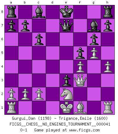 Last move : 0-1 2011 July 18 20:26:20 [Event "FICGS__CHESS__NO_ENGINES_TOURNAMENT__000041"] [Site "FICGS"] [Date "2011.05.02"] [Round "1"] [White "Gurgui,Dan"] [Black "Trigance,Emile"] [Result "0-1"] [WhiteElo "1198"] [BlackElo "1600"] 1.d4 Nf6 2.Nc3 d5 3.Bg5 Nbd7 4.Bxf6 Nxf6 5.Nf3 g6 6.Ne5 Bg7 7.f4 c6 8.e3 Nd7 9.g4 Nxe5 10.dxe5 f6 11.exf6 exf6 12.h4 Qe7 13.Qf3 f5 14.g5 d4 15.Ne2 dxe3 0-1 Queen's pawn game Player Black won this chess game. Follow this game move after move (download)After black's reply to 1.e4 with 1..e5, leaves him always trying to get into the game. (Howard Staunton) Das typische an einem Großmeister ist, daß er eine gewonnene Position schnell und schmerzlos gewinnt. (Irving Chernev) El Ajedrez era la lengua materna de Capablanca. (Reti) Les échecs, c'est l'imagination. (David Bronstein) But they are useless. They can only give you answers. (Pablo Picasso, about computers)