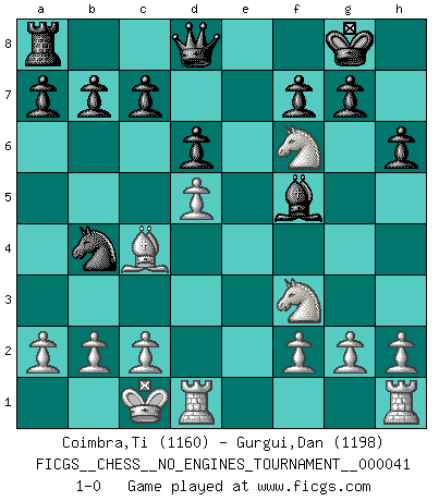 Last move : 1-0 2011 July 19 20:33:56 [Event "FICGS__CHESS__NO_ENGINES_TOURNAMENT__000041"] [Site "FICGS"] [Date "2011.05.02"] [Round "1"] [White "Coimbra,Ti"] [Black "Gurgui,Dan"] [Result "1-0"] [WhiteElo "1160"] [BlackElo "1198"] 1.e4 d6 2.d4 e6 3.Nc3 Nf6 4.Bg5 Be7 5.Nf3 O-O 6.Bc4 h6 7.Bxf6 Bxf6 8.Qd3 Nc6 9.d5 exd5 10.exd5 Nb4 11.Qe4 Re8 12.O-O-O Rxe4 13.Nxe4 Bf5 14.Nxf6+ 1-0 King's pawn Opening Kingside Castling by player Black (move 5) Queenside Castling by player White (move 12) Player White won this chess game. Follow this game move after move (download)A win by an unsound combination, however showy, fills me with artistic horror. (Wilhelm Steinitz) Fischer ist das größte Genie, das je vom Schachhimmel heruntergestiegen ist. (Mikhail Nekhemyevich Tal) El pensamiento metódico es mas útil en el Ajedrez que la inspiración. (C. J. S. Purdy) Je crois qu'il existe des manières très spécifiques de jouer efficacement contre une machine. Evidemment, nous n'avons aucune chance en technique pure, parce que l'ordinateur calcule de manière parfaite. Mais lorsque nous faisons appel à notre cerveau, en utilisant l'intuition et la compréhension, alors nous restons beaucoup plus forts. (Anatoli Karpov) Pushing plastic is for the many, pushing virtual pieces is for the fewer, pushing wood is for the very few. (Normajean Yates)