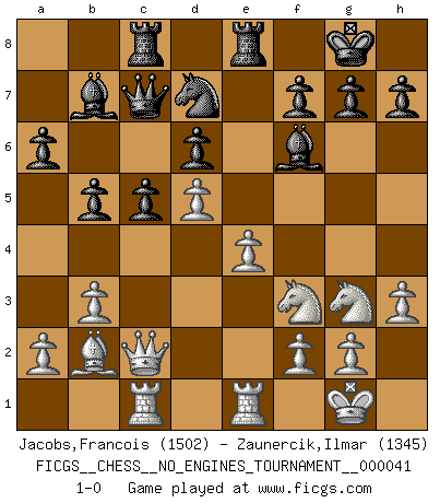 Last move : 1-0 2011 July 31 21:3:46 [Event "FICGS__CHESS__NO_ENGINES_TOURNAMENT__000041"] [Site "FICGS"] [Date "2011.05.02"] [Round "1"] [White "Jacobs,Francois"] [Black "Zaunercik,Ilmar"] [Result "1-0"] [WhiteElo "1502"] [BlackElo "1345"] 1.e4 e5 2.Nf3 Nc6 3.Bb5 a6 4.Ba4 Nf6 5.O-O Be7 6.Re1 O-O 7.c3 d6 8.h3 b5 9.Bc2 Bb7 10.d4 exd4 11.cxd4 Nb4 12.Nbd2 Nxc2 13.Qxc2 c5 14.d5 Re8 15.b3 Qc7 16.Bb2 Rac8 17.Rac1 Nd7 18.Nf1 Bf6 19.Ng3 1-0 This chess game has been lost on time (started : 2011.05.02 10:24:20) Ruy Lopez : Closed defense Kingside Castling by player White (move 5) Kingside Castling by player Black (move 6) Player White won this chess game. Follow this game move after move (download)A Chess game is a dialogue, a conversation between a player and his opponent. Each move by the opponent may contain threats or be a blunder, but a player cannot defend against threats or take advantage of blunders if he does not first ask himself: What is my opponent planning after each move ? (Bruce A. Moon) Karpov ist ein Museumsstück. (Garry Kasparov) Cada Peón es potencialmente una Reina. (James Mason) Comme les marins qui ont mille raisons différentes d'aller en mer, les joueurs d'échecs en ont tout autant avant de s'installer devant une table et jouer... (Vincent Bertignac, philosophe) A woman without a man is like a fish without a bicycle. (Gloria Steinem)