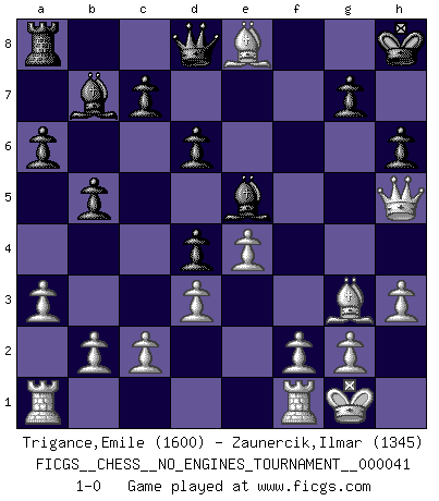 Last move : 1-0 2011 July 30 8:53:45 [Event "FICGS__CHESS__NO_ENGINES_TOURNAMENT__000041"] [Site "FICGS"] [Date "2011.05.02"] [Round "1"] [White "Trigance,Emile"] [Black "Zaunercik,Ilmar"] [Result "1-0"] [WhiteElo "1600"] [BlackElo "1345"] 1.e4 e5 2.Nc3 Nf6 3.Bc4 Bc5 4.d3 O-O 5.Bg5 h6 6.Bh4 Nc6 7.a3 a6 8.Nf3 b5 9.Ba2 Bb7 10.Nd5 Be7 11.Bg3 d6 12.h3 Nd4 13.Nxf6+ Bxf6 14.O-O Re8 15.Nxd4 exd4 16.Qh5 Be5 17.Bxf7+ Kh8 18.Bxe8 1-0 This chess game has been lost on time (started : 2011.05.02 10:24:20) Vienna game Kingside Castling by player Black (move 4) Kingside Castling by player White (move 14) Player White won this chess game. Follow this game move after move (download)Chess makes man wiser and clear-sighted. (Vladimir Putin) Ich glaube, ich kenne inzwischen die Gründe für mein Versagen: schachliche Charakterfehler. Ich war nie ein Wunderkind und in meiner gesamten menschlichen Entwicklung immer zu langsam. (Viktor Kortschnoi) El Ajedrez es una guerra en un tablero. El objetivo es aplastar la mente del oponente. (Bobby Fischer) Shah mat. Le roi est mort. Cri de fierté d'un joueur venant de terrasser son adversaire, courtoisement, sans effusion de sang. Nowadays, anyone who cannot speak English and is incapable of using the Internet is regarded as backward. (Al-Waleed bin Talal)