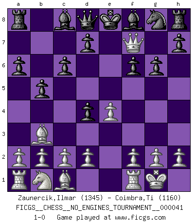 Last move : 1-0 2011 May 10 20:28:14 [Event "FICGS__CHESS__NO_ENGINES_TOURNAMENT__000041"] [Site "FICGS"] [Date "2011.05.02"] [Round "1"] [White "Zaunercik,Ilmar"] [Black "Coimbra,Ti"] [Result "1-0"] [WhiteElo "1345"] [BlackElo "1160"] 1.e4 e5 2.Nf3 Nc6 3.Bb5 a6 4.Ba4 Nd4 5.Nxd4 exd4 6.O-O b5 7.Bb3 f6 8.Qh5+ g6 9.Qd5 c6 10.Qf7+ 1-0 Ruy Lopez : Bird's defense deferred Kingside Castling by player White (move 6) Player White won this chess game. Follow this game move after move (download)Fischer sacrificed virtually everything most of us weakies (to use his term) value, respect, and cherish, for the sake of an artful, often beautiful board game, for the ambivalent privilege of being its greatest master. (Paul Kollar) Der Bart als Geschlechtszeichen mitten im Gesicht ist obszön. Daher gefällt er den Weibern. [Zugegeben, kein Schachzitat, aber unglaublich originell] (Arthur Schopenhauer) El Ajedrez es la vida. (Bobby Fischer) Tous ces prétendus hommes politiques sont les pions, les Cavaliers, les Tours ou les Fous d'une partie d'échecs qui se jouera tant qu'un hasard ne renversera pas l'échiquier. (Honoré de Balzac) If you don't practice you don't deserve to win. (Andre Agassi)