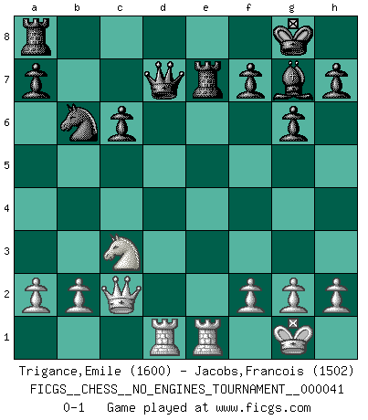 Last move : 0-1 2011 May 25 7:33:22 [Event "FICGS__CHESS__NO_ENGINES_TOURNAMENT__000041"] [Site "FICGS"] [Date "2011.05.02"] [Round "1"] [White "Trigance,Emile"] [Black "Jacobs,Francois"] [Result "0-1"] [WhiteElo "1600"] [BlackElo "1502"] 1.e4 c5 2.d4 cxd4 3.c3 Nf6 4.e5 Nd5 5.Nf3 Nc6 6.cxd4 d6 7.Bc4 Nb6 8.Bb5 dxe5 9.Nxe5 Bd7 10.Bxc6 Bxc6 11.Nxc6 bxc6 12.O-O g6 13.Re1 Bg7 14.Bg5 O-O 15.Bxe7 Qxd4 16.Nc3 Rfe8 17.Qc2 Qd7 18.Rad1 Rxe7 0-1 Sicilian : Smith-Morra gambit Kingside Castling by player White (move 12) Kingside Castling by player Black (move 14) Player Black won this chess game. Follow this game move after move (download)An attack on the wing should be met by play in the center. (Nimzovitch) Frage: Wie viele Autos haben Sie schon zerstört? - Antwort: Nur zwei. (Loek van Wely) El Rey es una pieza de pelea. ¡Usenlo!. (Wilhelm Steinitz) Les Echecs sont affaire de jugement sensible. Savoir quand frapper et quand esquiver. (Fischer) Drag your thoughts away from your troubles... by the ears, by the heels, or any other way you can manage it. (Mark Twain)