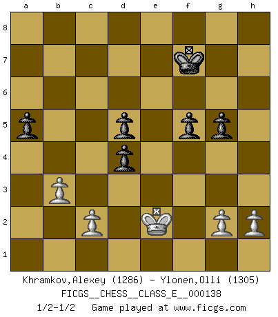 Last move : 1/2-1/2 2012 February 5 7:45:23 [Event "FICGS__CHESS__CLASS_E__000138"] [Site "FICGS"] [Date "2011.05.03"] [Round "1"] [White "Khramkov,Alexey"] [Black "Ylonen,Olli"] [Result "1/2-1/2"] [WhiteElo "1286"] [BlackElo "1305"] 1.e4 c5 2.Nc3 b6 3.f4 Bb7 4.Nf3 e6 5.Bc4 Nc6 6.a4 Nf6 7.d3 d5 8.exd5 Nxd5 9.Nxd5 exd5 10.Bb5 Be7 11.O-O O-O 12.d4 Nxd4 13.Nxd4 cxd4 14.Kh1 Qc7 15.Bd3 Bd6 16.Qh5 g6 17.Qh4 f5 18.Bd2 a5 19.Rae1 Bc6 20.b3 Qd8 21.Qh6 Qf6 22.Rf3 Rae8 23.Rh3 Rxe1+ 24.Bxe1 Qg7 25.Qxg7+ Kxg7 26.Rf3 Ba3 27.Kg1 Re8 28.Bf2 Bb2 29.Kf1 Kf7 30.Bg3 Bc3 31.Be2 h6 32.Be1 Bxe1 33.Kxe1 b5 34.axb5 Bxb5 35.Rf2 Rxe2+ 36.Rxe2 Bxe2 37.Kxe2 g5 38.fxg5 hxg5 1/2-1/2 Sicilian : Closed Kingside Castling by player White (move 11) Kingside Castling by player Black (move 11) This chess game ended in a draw. Follow this game move after move (download)It's always better to sacrifice your opponent's men. (Savielly Tartakover) Wenn Capablanka heute auf der Schachbühne erscheinen würde, hätte er ein halbes Jahr gebraucht um sich die Schachtheorie anzueignen. Und dann hätte er alles und jeden besiegt. (Mikhail Moiseyevich Botvinik) Hay dos clases de hombres: aquellos que se conforman en dejarse llevar por las circunstancias y que juegan barajas y aquellos decididos a controlar las circunstancias y que juegan al Ajedrez. (Mortimer Collins) Je ne crois pas en la psychologie, je crois aux bons coups. (Robert Fischer) What doesn't kill us makes us stronger. (Friedrich Nietzsche)