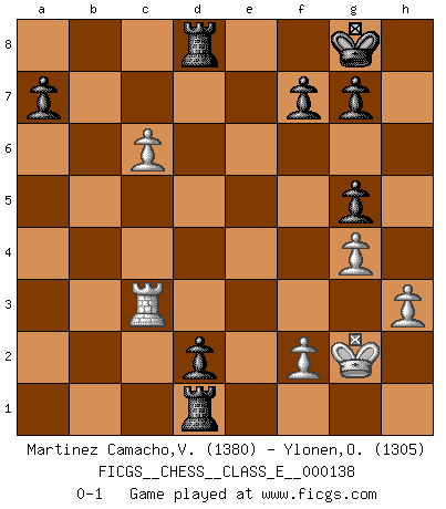 Last move : 0-1 2011 October 4 20:3:59 [Event "FICGS__CHESS__CLASS_E__000138"] [Site "FICGS"] [Date "2011.05.03"] [Round "1"] [White "Martinez Camacho,Victor Hugo"] [Black "Ylonen,Olli"] [Result "0-1"] [WhiteElo "1380"] [BlackElo "1305"] 1.e4 e5 2.Nf3 Nf6 3.Nxe5 d6 4.Nf3 Nxe4 5.Qe2 Qe7 6.d3 Nf6 7.Qxe7+ Bxe7 8.Be2 O-O 9.O-O Nc6 10.Nc3 Re8 11.Be3 Nb4 12.Bd1 c5 13.a3 Nbd5 14.Nxd5 Nxd5 15.Bd2 Bf6 16.Rb1 h6 17.c4 Nb6 18.Bc2 Bf5 19.b3 Nd7 20.h3 Rad8 21.b4 cxb4 22.axb4 Ne5 23.Nxe5 dxe5 24.Rb3 e4 25.b5 exd3 26.Bd1 Bg5 27.Bxg5 hxg5 28.g4 Bg6 29.Rc3 d2 30.c5 Bd3 31.c6 bxc6 32.bxc6 Bxf1 33.Kxf1 Re1+ 34.Kg2 Rxd1 0-1 Petrov : Cozio (Lasker) attack Kingside Castling by player Black (move 8) Kingside Castling by player White (move 9) Player Black won this chess game. Follow this game move after move (download)I'd rather have a Pawn than a finger. (Reuben Fine) Obwohl ich alt bin, darf mir niemand den Finger in den Mund stecken, sonst beisse ich. (Wilhelm Steinitz) Aquel que toma al Peón de Caballo de la Reina, se pasará la noche a dormir en la calle. (Anónimo) Tous ces prétendus hommes politiques sont les pions, les Cavaliers, les Tours ou les Fous d'une partie d'échecs qui se jouera tant qu'un hasard ne renversera pas l'échiquier. (Honoré de Balzac) Never was anything great achieved without danger. (Niccolo Machiavelli)