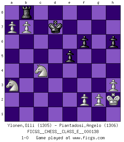 Last move : 1-0 2011 December 20 1:35:18 [Event "FICGS__CHESS__CLASS_E__000138"] [Site "FICGS"] [Date "2011.05.03"] [Round "1"] [White "Ylonen,Olli"] [Black "Piantadosi,Angelo"] [Result "1-0"] [WhiteElo "1305"] [BlackElo "1306"] 1.d4 d5 2.Nf3 Nf6 3.c4 e6 4.Nc3 Be7 5.Bg5 O-O 6.e3 Nbd7 7.Rc1 dxc4 8.Bxc4 c5 9.O-O a6 10.a4 b6 11.Qe2 Bb7 12.Rfd1 Qc7 13.e4 cxd4 14.Nxd4 Rac8 15.Bxa6 Qb8 16.Bxb7 Qxb7 17.e5 Nd5 18.Nxd5 Bxg5 19.Rxc8 Rxc8 20.Nf3 Bd8 21.Nc3 Bc7 22.Rxd7 Qc6 23.Rxc7 Qxc7 24.Qe3 Qd7 25.h3 h6 26.Qxb6 Ra8 27.Kh2 Qa7 28.Qxa7 Rxa7 29.Nd2 Kf8 30.Nc4 Ke7 31.a5 f6 32.exf6+ gxf6 33.Nb5 Ra6 34.b4 Rc6 35.Nba3 e5 36.b5 Rc5 37.a6 Rc8 38.b6 Kd7 39.b7 Rb8 40.a7 1-0 Queen's pawn game Kingside Castling by player Black (move 5) Kingside Castling by player White (move 9) Player White won this chess game. Follow this game move after move (download)Not all artists are Chess players, but all Chess players are artists. (Marcel Duchamp) Über Frauen: Chess is better. (Robert James Fischer) Los problemas de Ajedrez exigen del compositor las mismas virtudes que caracterizan todo el arte de valor: originalidad, invención, concisión, armonía, complejidad e insinceridad explendida. (Vladimir Nabokov) On est toujours la mazette de quelqu'un d'autre. (Anonyme) There's always a bigger fish. (Qui-Gon Jinn in Star Wars ep.1)