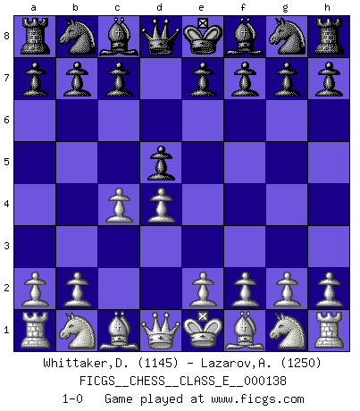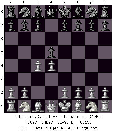 Last move : 1-0 2011 June 13 17:1:19 [Event "FICGS__CHESS__CLASS_E__000138"] [Site "FICGS"] [Date "2011.05.03"] [Round "1"] [White "Whittaker,Deon"] [Black "Lazarov,Alexander"] [Result "1-0"] [WhiteElo "1145"] [BlackElo "1250"] 1.d4 d5 2.c4 1-0 This chess game has been lost on time (started : 2011.05.03 16:43:51) Queen's Gambit Player White won this chess game. Follow this game move after move (download)Some part of a mistake is always correct. (Savielly Tartakover) Jede Eröffnung ist gut genug um gespielt zu werden, wenn nur ihr Ruf schlecht genug ist. (Savielly Grigorievitsch Tartakower) El Ajedrez es parte de la cultura, y si una cultura esta en decadencia, entonces también el Ajedrez declinará. (Mikhail Botvinnik) Les Echecs sont affaire de jugement sensible. Savoir quand frapper et quand esquiver. (Fischer) Somehow our devils are never quite what we expect when we meet them face to face. (Nelson DeMille)