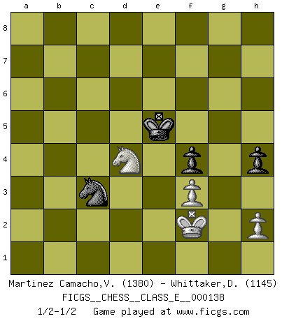 Last move : 1/2-1/2 2011 July 21 19:29:40 [Event "FICGS__CHESS__CLASS_E__000138"] [Site "FICGS"] [Date "2011.05.03"] [Round "1"] [White "Martinez Camacho,Victor Hugo"] [Black "Whittaker,Deon"] [Result "1/2-1/2"] [WhiteElo "1380"] [BlackElo "1145"] 1.e4 e5 2.Nf3 Nc6 3.Bb5 a6 4.Ba4 Nf6 5.O-O Nxe4 6.Re1 f5 7.d3 Nf6 8.Nxe5 Be7 9.Nxc6 dxc6 10.Nc3 b5 11.Bb3 a5 12.Qf3 Bd7 13.Be6 Ra6 14.Bf4 b4 15.Bxd7+ Qxd7 16.Ne2 Nd5 17.Bd2 O-O 18.Ng3 Rf7 19.Re2 g6 20.Rae1 Kf8 21.Bh6+ Ke8 22.Re6 Rb6 23.Bg5 c5 24.Rxb6 cxb6 25.Bxe7 Rxe7 26.Qd1 h5 27.Nf1 Re6 28.Nd2 Nf4 29.Nc4 Qc6 30.Rxe6+ Qxe6 31.f3 Ne2+ 32.Kf2 Nd4 33.c3 bxc3 34.bxc3 Nb5 35.Qd2 Qf6 36.d4 cxd4 37.cxd4 Qxd4+ 38.Qxd4 Nxd4 39.Nxb6 f4 40.Nc4 a4 41.Nb6 a3 42.Nc4 Nc2 43.g3 g5 44.Nd6+ Ke7 45.Ne4 Nb4 46.Nc3 h4 47.gxh4 gxh4 48.Kg2 Kf6 49.Nb5 Nc2 50.Kh3 Kg5 51.Nc7 Nd4 52.Kg2 Kh5 53.Nd5 Kg5 54.Nb6 Kh5 55.Nc4 Nc2 56.Kf2 Nb4 57.Nxa3 Nxa2 58.Nc2 Nc3 59.Nd4 Kg5 60.Ne6+ Kf5 61.Nd4+ Ke5 62.Nc6+ Kf5 63.Nd4+ Ke5 64.Nc6+ Kf6 65.Nd4 Ke5 1/2-1/2 Ruy Lopez : Open (Tarrasch) defense Kingside Castling by player White (move 5) Kingside Castling by player Black (move 17) 10 pieces endgame at move 47 : White KNPPP , Black KNPPP WHITE : King + 1 Knight 3 Pawns BLACK : King + 1 Knight 3 Pawns 9 pieces endgame at move 57 : White KNPPP , Black KNPP WHITE : King + 1 Knight 3 Pawns BLACK : King + 1 Knight 2 Pawns 8 pieces endgame at move 57 : White KNPP , Black KNPP WHITE : King + 1 Knight 2 Pawns BLACK : King + 1 Knight 2 Pawns This chess game ended in a draw. Follow this game move after move (download)A chess genius has died; a loss for humanity. (Viktor Kortchnoi, about Bobby Fischer's death) Mein Gehirn das ist mein zweitwichtigstes Organ [Aus dem Film: Der Schläfer]. (Woody Allen) Si tu oponente no puede hacer nada activo, entonces no apures la posición; En vez de eso, dejalo estar sentado ahí, sufriendo y rogandote por un empate. (Jeremy Silman) Les échecs, c'est la lutte contre l'erreur. (Johannes Zukertort) I couldn't make any sense out of what this particular thread is about. It sounds like R2 D2 computer speaking. A space fight ?!? Some 'command' problems in Moscow ? Some killers & narcotic addicts attacking some game & a god wannabe ?? (Dinesh De Silva, lost in a russian conflict in FICGS forum)
