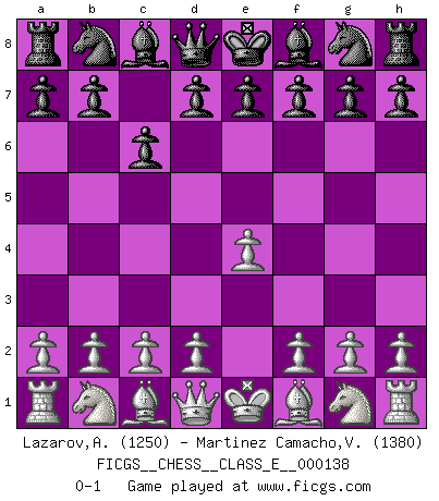 Last move : 0-1 2011 June 13 17:1:34 [Event "FICGS__CHESS__CLASS_E__000138"] [Site "FICGS"] [Date "2011.05.03"] [Round "1"] [White "Lazarov,Alexander"] [Black "Martinez Camacho,Victor Hugo"] [Result "0-1"] [WhiteElo "1250"] [BlackElo "1380"] 1.e4 c6 0-1 This chess game has been lost on time (started : 2011.05.03 16:43:51) Caro-Kann defense Player Black won this chess game. Follow this game move after move (download)You need not play well - just help your opponent to play badly. (Genrikh Chepukaitis) Ich verachte Kasparow. (Viktor Kortschnoi) Un Peón pasado es un criminal, quién debe ser mantenido bajo candado y llave. Leves medidas, tales como vigilancia policiaca, no son suficientes. (Aaron Nimzovich) Le génie consiste à savoir transgresser les règles au moment opportun. (Teichmann) There is no vagueness without wind. (Chinese proverb)