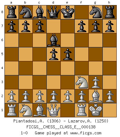 Last move : 1-0 2011 June 17 7:51:8 [Event "FICGS__CHESS__CLASS_E__000138"] [Site "FICGS"] [Date "2011.05.03"] [Round "1"] [White "Piantadosi,Angelo"] [Black "Lazarov,Alexander"] [Result "1-0"] [WhiteElo "1306"] [BlackElo "1250"] 1.g3 d5 2.Bg2 e5 3.Nf3 Bd6 4.O-O 1-0 This chess game has been lost on time (started : 2011.05.03 16:43:51) Benko's Opening Kingside Castling by player White (move 4) Player White won this chess game. Follow this game move after move (download)The winner of the game is the player who makes the next-to-last mistake. (Savielly Tartakover) Der Bart als Geschlechtszeichen mitten im Gesicht ist obszön. Daher gefällt er den Weibern. [Zugegeben, kein Schachzitat, aber unglaublich originell] (Arthur Schopenhauer) Cuando tu no sabes absolutamente que mas hacer, es tiempo de entrar en pánico. (John van der Wiel) On n'a jamais que l'âge auquel on a commence à jouer aux échecs car après on cesse de vieillir. (Capablanca) I find television to be very educating. Every time somebody turns on the set, I go in the other room and read a book. (Groucho Marx)