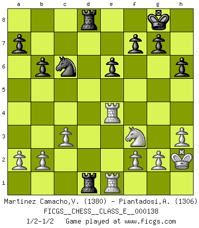 Last move : 1/2-1/2 2011 June 28 17:32:33 [Event "FICGS__CHESS__CLASS_E__000138"] [Site "FICGS"] [Date "2011.05.03"] [Round "1"] [White "Martinez Camacho,Victor Hugo"] [Black "Piantadosi,Angelo"] [Result "1/2-1/2"] [WhiteElo "1380"] [BlackElo "1306"] 1.e4 e6 2.d4 d5 3.Nd2 dxe4 4.Nxe4 Nd7 5.Nf3 Ngf6 6.Bg5 Be7 7.Nxf6+ Nxf6 8.Bd3 O-O 9.O-O b6 10.c3 Bb7 11.Re1 c5 12.dxc5 Bxc5 13.Qc2 h6 14.Be3 Bxe3 15.Rxe3 Rc8 16.Rd1 Nd5 17.R3e1 Qc7 18.Bh7+ Kh8 19.Be4 Nb4 20.Qb1 Bxe4 21.Rxe4 Nc6 22.Rde1 Rfd8 23.R4e2 Rd5 24.h3 Rcd8 25.Qc2 Qf4 26.Qe4 Qxe4 27.Rxe4 Kg8 28.Kh2 Rd1 1/2-1/2 French : Tarrasch Kingside Castling by player Black (move 8) Kingside Castling by player White (move 9) This chess game ended in a draw. Follow this game move after move (download)He who takes the Queen's Knight's Pawn will sleep in the streets. (Anonymous) Besser ein falscher Plan, logisch durchgeführt, als gar kein Plan. (Viktor Kortschnoi) Botvinnik trató de alejar el misterio referente al Ajedrez, siempre relacionandolo a situaciones de la vida diaria. Solía llamar al Ajedrez un problema inexacto típico, similar a aquellos en que la gente tiene siempre que resolver a cada día. (Garry Kasparov) Il (Jacob Murray) ne joue pas pour le bon coup, mais pour le meilleur. (Eloi Relange) First of all, we have to go back to the classical time control. (Anatoly Karpov)