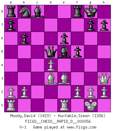 Last move : 0-1 2011 June 10 23:14:16 [Event "FICGS__CHESS__RAPID_D__000056"] [Site "FICGS"] [Date "2011.05.03"] [Round "1"] [White "Moody,David"] [Black "Huxtable,Simon"] [Result "0-1"] [WhiteElo "1423"] [BlackElo "1336"] 1.e4 c6 2.d4 d5 3.exd5 cxd5 4.c4 Nf6 5.Nc3 e6 6.Nf3 Be7 7.cxd5 Nxd5 8.Ne5 O-O 9.Bd3 Nf6 10.O-O b6 11.Qf3 Nd5 12.Qh3 f5 13.Re1 Bf6 14.Nxd5 Qxd5 15.Be3 Bxe5 0-1 Caro-Kann : Panov-Botvinnik attack, 5...e6 Kingside Castling by player Black (move 8) Kingside Castling by player White (move 10) Player Black won this chess game. Follow this game move after move (download)Robert Fischer is a law unto himself. (Larry Evans) Es liegt in der Natur, vernüftig zu denken und unlogisch zu handeln. (Anatole France) Los Peones son nacidos libres, y aún así, se encuentran por doquier encadenados. (Rick Kennedy) Si rien de grave n'est détecté lors de l'analyse d'une position, on joue alors le coup. Seconde règle de Blumenfeld. However beautiful the strategy, you should occasionally look at the results. (Winston Churchill)