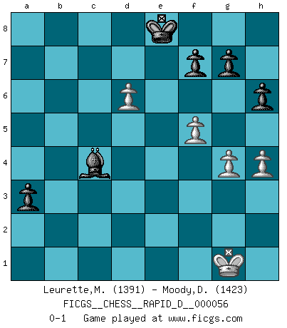Last move : 0-1 2011 May 27 8:46:37 [Event "FICGS__CHESS__RAPID_D__000056"] [Site "FICGS"] [Date "2011.05.03"] [Round "1"] [White "Leurette,Marc-Antoine"] [Black "Moody,David"] [Result "0-1"] [WhiteElo "1391"] [BlackElo "1423"] 1.e4 e5 2.Nf3 Nc6 3.Bc4 Nf6 4.Ng5 d5 5.exd5 Na5 6.d3 h6 7.Nf3 e4 8.Qe2 Nxc4 9.dxc4 Bc5 10.Be3 exf3 11.Qxf3 Bxe3 12.Qxe3+ Qe7 13.Qxe7+ Kxe7 14.O-O Bf5 15.Re1+ Kd7 16.Re2 Rhe8 17.Rxe8 Rxe8 18.Nc3 Bxc2 19.Rc1 a6 20.g3 Bd3 21.b3 Ne4 22.Nxe4 Bxe4 23.Re1 Bf3 24.Rxe8 Kxe8 25.a4 Bd1 26.b4 Bxa4 27.c5 Bb5 28.f4 Bc4 29.d6 cxd6 30.cxd6 b6 31.h4 a5 32.bxa5 bxa5 33.g4 a4 34.f5 a3 0-1 Two knights defense : Kieseritsky variation Kingside Castling by player White (move 14) Player Black won this chess game. Follow this game move after move (download)Who is your opponent tonight, tonight I am playing against the Black pieces. (Akiba Rubinstein) Zu meiner Zeit war ein 20 jähriger ein junger Spieler, heute ist er ein Veteran. (Garry Kasparov) En partidas rápidas, el Caballo es mas poderoso que el Alfil. (Vlastimil Hort) La vérité est comme le meilleur coup aux échecs : elle existe, mais il faut la chercher. (Arturo Perez-Reverte) O divine art of subtlety and secrecy! Through you we learn to be invisible, through you inaudible and hence we can hold the enemy's fate in our hands. (Sun Tzu)