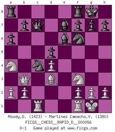 Last move : 0-1 2011 May 19 1:54:50 [Event "FICGS__CHESS__RAPID_D__000056"] [Site "FICGS"] [Date "2011.05.03"] [Round "1"] [White "Moody,David"] [Black "Martinez Camacho,Victor Hugo"] [Result "0-1"] [WhiteElo "1423"] [BlackElo "1380"] 1.e4 c6 2.d4 d5 3.exd5 cxd5 4.c4 e6 5.Nc3 Nf6 6.Nf3 Nbd7 7.cxd5 exd5 8.Bd3 Be7 9.Bf4 a6 10.O-O O-O 11.Rc1 Nb6 12.Qb3 Be6 13.Bc7 Qxc7 14.Na4 Nc4 0-1 Caro-Kann : Panov-Botvinnik attack Kingside Castling by player White (move 10) Kingside Castling by player Black (move 10) Player Black won this chess game. Follow this game move after move (download)I thought the most common mistake [in chess] was the first one: Learning the game :P (Garvin Gray, FICGS forum) Nach Morphy wurde nichts neues mehr in der Behandlung offener Positionen gefunden. (Mikhail Moiseyevich Botvinik) Debes de llevar a tu oponente hacia un profundo y obscuro bosque donde 2+2=5, y el camino que conduce a la salida es suficientemente ancho para solamente uno. (Mikhail Tal) A chaque perte on perd un peu de soi. (Joël Lautier) Hardware: the parts of a computer that can be kicked. (Jeff Persis)