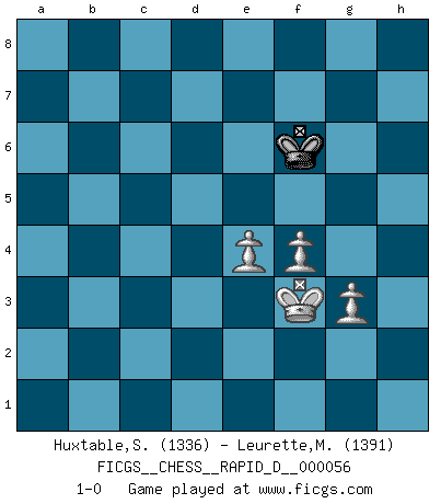 Last move : 1-0 2011 June 22 17:3:16 [Event "FICGS__CHESS__RAPID_D__000056"] [Site "FICGS"] [Date "2011.05.03"] [Round "1"] [White "Huxtable,Simon"] [Black "Leurette,Marc-Antoine"] [Result "1-0"] [WhiteElo "1336"] [BlackElo "1391"] 1.d4 d5 2.c3 Nf6 3.Bg5 Nc6 4.Nd2 e5 5.e3 e4 6.c4 dxc4 7.Bxc4 Be6 8.Bxe6 fxe6 9.Nxe4 Be7 10.Nxf6+ Bxf6 11.Bxf6 gxf6 12.Qh5+ Ke7 13.Ne2 Qg8 14.O-O Qg5 15.Qf3 Rag8 16.Ng3 h5 17.Rac1 Qg4 18.Qe2 h4 19.f3 Qg6 20.Ne4 h3 21.g3 f5 22.Nc5 Nd8 23.Nxb7 c6 24.Na5 Kd7 25.Qc4 e5 26.dxe5 Qe6 27.Rfd1+ Ke7 28.Nxc6+ Nxc6 29.Qxc6 Qxc6 30.Rxc6 Rc8 31.Rdc1 Rxc6 32.Rxc6 Rd8 33.f4 Rd1+ 34.Kf2 Rd2+ 35.Kg1 Rxb2 36.Rc7+ Ke6 37.Rh7 Rxa2 38.Rxh3 a5 39.Rh6+ Ke7 40.h4 a4 41.h5 a3 42.Ra6 Ra1+ 43.Kg2 a2 44.h6 Kf7 45.h7 Kg7 46.Ra7+ Kh8 47.e6 Rb1 48.Rxa2 Kxh7 49.Ra5 Rb7 50.Rxf5 Kg7 51.Rf7+ Rxf7 52.exf7 Kxf7 53.Kf3 Kf6 54.e4 1-0 Queen's pawn game Kingside Castling by player White (move 14) 10 pieces endgame at move 48 : White KRPPPPP , Black KRP WHITE : King + 1 Rook 5 Pawns BLACK : King + 1 Rook 1 Pawn 9 pieces endgame at move 48 : White KRPPPP , Black KRP WHITE : King + 1 Rook 4 Pawns BLACK : King + 1 Rook 1 Pawn 8 pieces endgame at move 50 : White KRPPPP , Black KR WHITE : King + 1 Rook 4 Pawns BLACK : King + 1 Rook 7 pieces endgame at move 51 : White KPPPP , Black KR WHITE : King + 4 Pawns BLACK : King + 1 Rook 6 pieces endgame at move 52 : White KPPPP , Black K WHITE : King + 4 Pawns BLACK : King + 5 pieces endgame at move 52 : White KPPP , Black K WHITE : King + 3 Pawns BLACK : King + Player White won this chess game. Follow this game move after move (download)I had a toothache during the first game. In the second game I had a headache. In the third game it was an attack of rheumatism. In the fourth game, I wasn't feeling well. And in the fifth game? Well, must one have to win every game ? (Siegbert Tarrasch) Über Kasparov: Es ist offensichtlich, daß er in einem totalitären Staat aufwuchs und deshalb zu diktatorischen Zügen neigt. (Viktor Kortschnoi) Hoy en día, si tu no eres un Gran Maestro a los 14 años, es mejor que lo olvides. (Anand Viswanathan) Horreur, mais aussi harmonie suprême : qu'y avait-il en effet au monde en dehors des échecs ? Le brouillard, l'inconnu, le non-être... (Vladimir Nabokov) When the going gets tactical, the computers get going. (Hyatt)