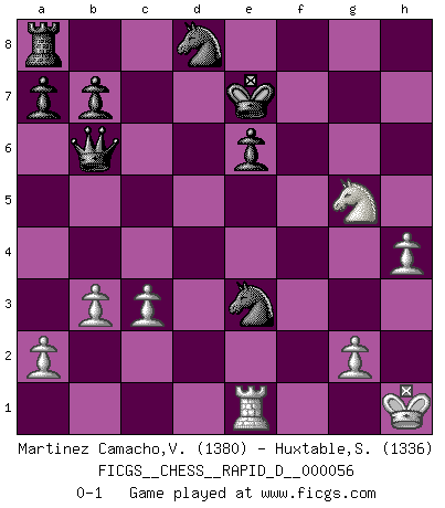 Last move : 0-1 2011 July 6 20:12:3 [Event "FICGS__CHESS__RAPID_D__000056"] [Site "FICGS"] [Date "2011.05.03"] [Round "1"] [White "Martinez Camacho,Victor Hugo"] [Black "Huxtable,Simon"] [Result "0-1"] [WhiteElo "1380"] [BlackElo "1336"] 1.e4 c6 2.d4 d5 3.Nd2 dxe4 4.Nxe4 Bf5 5.Ng3 Bg6 6.c3 e6 7.h4 h6 8.Nf3 Bd6 9.Bd3 Bxg3 10.fxg3 Bxd3 11.Qxd3 Nf6 12.Be3 c5 13.Rd1 cxd4 14.Bxd4 Nc6 15.O-O Ng4 16.Bxg7 Rg8 17.Qh7 Qb6+ 18.Kh1 Ke7 19.Bxh6 Rg6 20.Bc1 Nf6 21.Bg5 Rxg5 22.Qxf7+ Kxf7 23.Nxg5+ Ke7 24.Rde1 Nd8 25.b3 Qc7 26.Rf3 Nh5 27.Rfe3 Nxg3+ 28.Kg1 Qb6 29.Kh2 Nf1+ 30.Kh1 Nxe3 0-1 Caro-Kann : 3.Nd2 Kingside Castling by player White (move 15) Player Black won this chess game. Follow this game move after move (download)Bobby Fischer's current state of mind is indeed a tragedy. One of the world's greatest Chess players - the pride and sorrow of American Chess. (Frank Brady) Ein Kibitz ist einer, der deinem Gegner gute Ratschläge gibt. (Andrew Soltis) Aquellos que dicen que entienden al Ajedrez, no entienden nada. (Robert Hubner) Si je n'étais pas joueur d'échecs, je serais le meilleur dans quelque chose d'autre. (Anatoli Karpov) Information on the Internet is subject to the same rules and regulations as conversation at a bar. (George Lundberg)