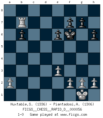 Last move : 1-0 2011 July 18 19:48:10 [Event "FICGS__CHESS__RAPID_D__000056"] [Site "FICGS"] [Date "2011.05.03"] [Round "1"] [White "Huxtable,Simon"] [Black "Piantadosi,Angelo"] [Result "1-0"] [WhiteElo "1336"] [BlackElo "1306"] 1.d4 Nf6 2.c3 d5 3.Bg5 e6 4.e3 Be7 5.Nf3 O-O 6.Bd3 Nbd7 7.O-O c5 8.c4 dxc4 9.Bxc4 Ne4 10.Bxe7 Qxe7 11.Nc3 Ndf6 12.Nxe4 Nxe4 13.Bd3 b6 14.Bxe4 Rb8 15.Qc2 h6 16.Ne5 Bb7 17.dxc5 Qxc5 18.Nd7 Qxc2 19.Bxc2 Rbc8 20.Nxf8 Rxc2 21.Nd7 Rxb2 22.Ne5 Kf8 23.Nc4 Rc2 24.Rfc1 Rxc1+ 25.Rxc1 Ke7 26.Nxb6 Kf6 27.Rc7 axb6 28.Rxb7 1-0 Queen's pawn game Kingside Castling by player Black (move 5) Kingside Castling by player White (move 7) Player White won this chess game. Follow this game move after move (download)Many Chess players were surprised when after the game, Fischer quietly explained: 'I had already analyzed this possibility' in a position which I thought was not possible to foresee from the opening. (Mikhail Tal) Matt entspricht nicht immer den Tatsachen. (Savielly Grigorievitsch Tartakower) Las piezas de Ajedrez son los bloques del alfabeto que moldean los pensamientos; y esos pensamientos, aunque hagan un diseño visual en el tablero, expresan abstractamente su belleza como un poema. (Marcel Duchamp) Tout change constamment, y compris dans le monde des Echecs. (Botvinnik) Perhaps the current trend of many chess professionals taking up the more lucrative pastime of poker is not a wholly negative one. It may not be too late for humans to relearn how to take risks in order to innovate and thereby maintain the advanced lifestyles we enjoy. And if it takes a poker-playing supercomputer to remind us that we can't enjoy the rewards without taking the risks, so be it. (The Chess Master and the Computer, by Garry Kasparov - 2010)