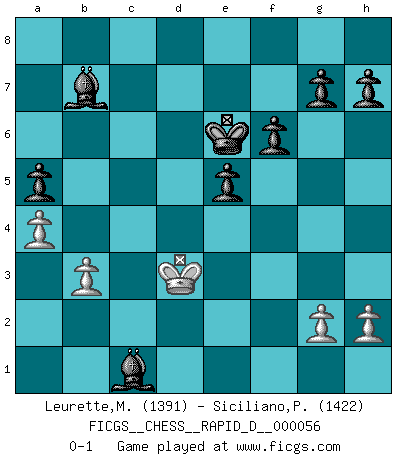 Last move : 0-1 2011 June 23 20:48:27 [Event "FICGS__CHESS__RAPID_D__000056"] [Site "FICGS"] [Date "2011.05.03"] [Round "1"] [White "Leurette,Marc-Antoine"] [Black "Siciliano,Pablo"] [Result "0-1"] [WhiteElo "1391"] [BlackElo "1422"] 1.e4 c5 2.Nf3 e6 3.Nc3 Nc6 4.Bb5 Nge7 5.d4 cxd4 6.Nxd4 Nxd4 7.Qxd4 Nc6 8.Bxc6 bxc6 9.O-O Qb6 10.Qe3 Qxe3 11.Bxe3 f6 12.Rad1 Be7 13.a3 d5 14.exd5 cxd5 15.Ne2 a5 16.a4 Bd7 17.b3 Rc8 18.c3 Rb8 19.Nc1 Kf7 20.c4 Bc6 21.cxd5 Bxd5 22.Rd3 Rhc8 23.Bf4 Ra8 24.Rfd1 Be4 25.Rd4 Bc2 26.Re1 e5 27.Rd7 Ke6 28.Rb7 Bb4 29.Re2 Bd1 30.Re3 Rxc1 31.f3 Bxf3 32.Kf2 Bxb7 33.Re2 Rd8 34.Bxc1 Rd3 35.Re3 Bc5 36.Ke2 Bxe3 37.Kxd3 Bxc1 0-1 Sicilian defense Kingside Castling by player White (move 9) Player Black won this chess game. Follow this game move after move (download)Any material change in a position must come about by mate, a capture, or a Pawn promotion. (Purdy) Die meiste Zeit treffe ich auf Gegner, die meine Enkel sein könnten. Ich bin da, um ihnen zu zeigen, dass sie von mir noch einiges lernen können. (Viktor Kortschnoi) Combinaciones deslumbrantes son para la mayoría, mover madera es para los pocos. (Georg Kieninger) Ce qui est bien, c'est d'avoir tout un tas de pièces en prise : l'adversaire ne peut en prendre qu'une à la fois. Cité par Thierry Audin. Computer Science is no more about computers than astronomy is about telescopes. (Edsger W. Dijkstra)
