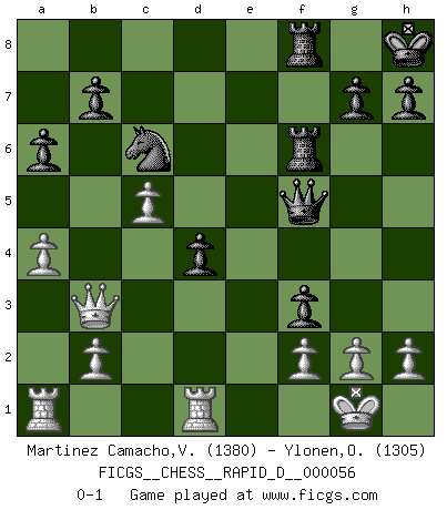 Last move : 0-1 2011 June 28 17:29:40 [Event "FICGS__CHESS__RAPID_D__000056"] [Site "FICGS"] [Date "2011.05.03"] [Round "1"] [White "Martinez Camacho,Victor Hugo"] [Black "Ylonen,Olli"] [Result "0-1"] [WhiteElo "1380"] [BlackElo "1305"] 1.e4 c5 2.Nf3 d6 3.d4 cxd4 4.Nxd4 Nf6 5.Nc3 a6 6.a4 e5 7.Nf3 Be7 8.Bc4 O-O 9.O-O Be6 10.Bxe6 fxe6 11.Be3 Nc6 12.Qd2 d5 13.exd5 exd5 14.Bg5 d4 15.Bxf6 Bxf6 16.Ne4 Qd5 17.Nxf6+ Rxf6 18.Rfd1 Raf8 19.Qd3 e4 20.c4 Qf5 21.Qb3 exf3 22.c5 Kh8 0-1 Sicilian : Najdorf Kingside Castling by player Black (move 8) Kingside Castling by player White (move 9) Player Black won this chess game. Follow this game move after move (download)The mistakes are there, waiting to be made. (Savielly Tartakower) Wenn du nicht weißt was du tun sollst, warte bis dein Gegner eine Idee hat. Sie wird sicher schlecht sein. (Siegbert Tarrasch) En la vida, como en el Ajedrez, los Peones propios obstruyen nuestro camino. La gran fortuna de un hombre, su comodidad, placer, hijos, libros, que deberían ayudarle a ganar, con mucha frecuencia lo ponen en Jaque Mate. (Charles Buxton) La tactique, c'est ce que vous faites quand il y a quelque chose à faire; la stratégie, c'est ce que vous faites quand il n'y a rien à faire. (Savielli Tartacower) Your best chance to get a Royal Flush in a casino is in the bathroom. (Anonymous)