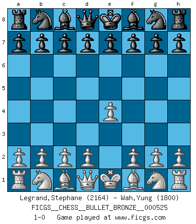 Last move : 1-0 2011 May 4 5:33:32 [Event "FICGS__CHESS__BULLET_BRONZE__000525"] [Site "FICGS"] [Date "2011.05.03"] [Round "1"] [White "Legrand,Stephane"] [Black "Wah,Yung"] [Result "1-0"] [WhiteElo "2164"] [BlackElo "1800"] 1.e4 1-0 This chess game has been lost on time (started : 2011.05.03 18:44:19) King's pawn Opening Player White won this chess game. Follow this game move after move (download)If you aren't afraid of Spassky, then I have removed the element of money. (Jim Slater) Wenn ich gewinne bin ich ein Genie. Wenn nicht, dann bin ich keines. (Robert James Fischer) ¿Se han dado cuenta de que Fischer casi nunca ha tenido piezas malas? El las intercambia y las piezas malas se quedan con sus oponenets. (Yuri Balashov) La vérité est comme le meilleur coup aux échecs : elle existe, mais il faut la chercher. (Arturo Perez-Reverte) When you stop learning you start dying. (Scott Adams)