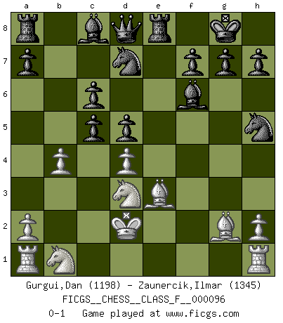 Last move : 0-1 2011 July 25 20:44:56 [Event "FICGS__CHESS__CLASS_F__000096"] [Site "FICGS"] [Date "2011.05.04"] [Round "1"] [White "Gurgui,Dan"] [Black "Zaunercik,Ilmar"] [Result "0-1"] [WhiteElo "1198"] [BlackElo "1345"] 1.e4 e5 2.f4 exf4 3.Nf3 d6 4.d4 Nf6 5.Bxf4 Nxe4 6.Qe2 d5 7.c4 Be7 8.c5 O-O 9.Ne5 Nd7 10.Nd3 c6 11.b4 b6 12.g3 Re8 13.Qh5 Bf6 14.Bg2 Nxg3 15.Kd2 Nxh5 16.Be3 bxc5 0-1 KGA : Fischer defense Kingside Castling by player Black (move 8) Player Black won this chess game. Follow this game move after move (download)The hardest game to win is a won game. (Emanuel Lasker) Mein Gehirn das ist mein zweitwichtigstes Organ [Aus dem Film: Der Schläfer]. (Woody Allen) El tablero es el mundo, las piezas es el fenomeno del universo, las reglas del juego son lo que llamamos leyes de la naturaleza y el jugador del lado opuesto, se encuentra oculto a nuestra vista. (Thomas Huxley) Aux échecs, l'amour-propre est satisfait quand on remporte la victoire, mais il n'y a pas de honte à être battu. (Benjamin Franklin) Animated gif is worth one mega-word. (Unknown)