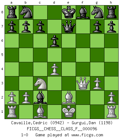 Last move : 1-0 2011 July 19 8:34:50 [Event "FICGS__CHESS__CLASS_F__000096"] [Site "FICGS"] [Date "2011.05.04"] [Round "1"] [White "Cavaille,Cedric"] [Black "Gurgui,Dan"] [Result "1-0"] [WhiteElo "0942"] [BlackElo "1198"] 1.e4 d6 2.Nf3 e5 3.Nc3 f5 4.exf5 Bxf5 5.d4 e4 6.Nh4 Qxh4 7.g3 Qd8 8.f3 exf3 9.Qxf3 Bxc2 10.Bd3 Qe7+ 11.Be2 1-0 King's pawn Opening Player White won this chess game. Follow this game move after move (download)Mistrust is the most necessary characteristic of the Chess player. (Siegbert Tarrasch) Die Arbeit ist etwas Unnatürliches. Die Faulheit allein ist göttlich. (Anatole France) En la vida, como en el Ajedrez, los Peones propios obstruyen nuestro camino. La gran fortuna de un hombre, su comodidad, placer, hijos, libros, que deberían ayudarle a ganar, con mucha frecuencia lo ponen en Jaque Mate. (Charles Buxton) Dieu déplace le joueur, et celui-ci la pièce. Quel Dieu derrière Dieu commence donc la trame ? Arturo Perez-Reverte (prix de littérature policière 1993). The intuitive mind is a sacred gift; the rational mind is a faithful servant. We have created a society that honors the servant but has forgotten the gift. (Albert Einstein)