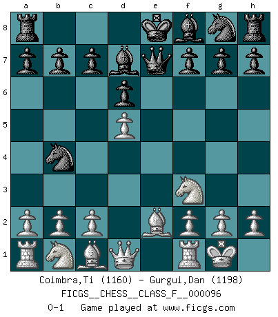 Last move : 0-1 2011 June 15 19:46:18 [Event "FICGS__CHESS__CLASS_F__000096"] [Site "FICGS"] [Date "2011.05.04"] [Round "1"] [White "Coimbra,Ti"] [Black "Gurgui,Dan"] [Result "0-1"] [WhiteElo "1160"] [BlackElo "1198"] 1.e4 d6 2.d4 e6 3.Nf3 Nc6 4.d5 exd5 5.exd5 Qe7+ 6.Be2 Nb4 7.O-O Bd7 0-1 This chess game has been lost on time (started : 2011.05.04 9:3:19) King's pawn Opening Kingside Castling by player White (move 7) Player Black won this chess game. Follow this game move after move (download)The sign of a great Master is his ability to win a won game quickly and painlessly. (Irving Chernev) Der 70jährige Viktor Kortschnoi: Die Rentenanstalt wollte mich zwingen in Rente zu gehen. Meine Frau erhält jetzt eine Pension- und ich zahle weiter in die Rentenkasse ein! (Viktor Kortschnoi) En el Ajedrez, tal como es jugado por los Maestros, practicamente la suerte es eliminada. (Emanuel Lasker) Les échecs sont un jeu par leur forme, un art par leur essence et une science par sa difficulté d'acquisition. Ils peuvent vous procurer autant de plaisir qu'un bon livre ou une belle musique, mais vous n'aurez une réelle joie que si vous arrivez à bien jouer. (Tigran Petrosian) A woman without a man is like a fish without a bicycle. (Gloria Steinem)