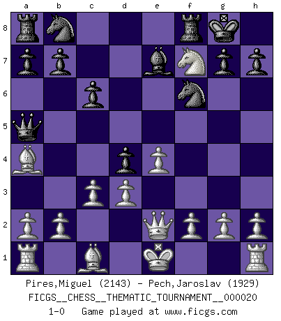 Last move : 1-0 2007 March 3 19:49:56 [Event "FICGS__CHESS__THEMATIC_TOURNAMENT__000020"] [Site "FICGS"] [Date "2006.12.22"] [Round "1"] [White "Pires,Miguel"] [Black "Pech,Jaroslav"] [Result "1-0"] [WhiteElo "2143"] [BlackElo "1929"] 1.e4 e5 2.Bb5 c6 3.Ba4 d5 4.Nc3 d4 5.Nce2 Nf6 6.d3 Be7 7.Nf3 Bg4 8.c3 O-O 9.Nxe5 Bxe2 10.Qxe2 Qa5 11.Nxf7 1-0 King's pawn game Kingside Castling by player Black (move 8) Player White won this chess game. Follow this game move after move (download)When your house is on fire, you can't be bothered with the neighbors. Or, as we say in Chess, if your King is under attack you don't worry about losing a Pawn on the Queen's side. (Gary Kasparov) Ich trinke, ich rauche, ich spiele, ich liebe Frauen aber Fernschach ist ein Laster, das ich nicht habe. (Mikhail Nekhemyevich Tal) El Ajedrez es una manera fabulosa para que los niños aprendan a autovalorarse y a autoestimarse. (Saudin Robovic) On a dit que l'homme se distingue de l'animal par le fait qu'il achète plus de livres qu'il ne peut en lire. Je voudrais suggérer qu'inclure à la liste des livres quelques livres d'échecs rendrait la distinction manifeste. (Edward Lasker) 98% of all statistics are made up. (Author unknown)