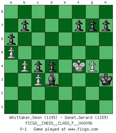 Last move : 0-1 2011 May 27 20:12:0 [Event "FICGS__CHESS__CLASS_F__000096"] [Site "FICGS"] [Date "2011.05.04"] [Round "1"] [White "Whittaker,Deon"] [Black "Gonet,Gerard"] [Result "0-1"] [WhiteElo "1145"] [BlackElo "1159"] 1.e4 Nc6 2.Nf3 Nf6 3.Nc3 a6 4.e5 Ng4 5.Ne4 Ngxe5 6.Nxe5 Nxe5 7.h3 d5 8.Ng3 c5 9.f4 Nc6 10.b3 e5 11.d3 Bd6 12.Bb2 O-O 13.Bxe5 Re8 14.Be2 Nxe5 15.d4 Ng6 16.Qd2 Bxf4 17.Qd3 Bxg3+ 18.Qxg3 Qa5+ 19.Kf2 Qd2 20.Rhe1 Qxd4+ 21.Kf1 Nf4 22.Qf2 Qxf2+ 23.Kxf2 Bf5 24.c3 Nd3+ 25.Bxd3 Bxd3 26.Rxe8+ Rxe8 27.Re1 Kf8 28.Re3 c4 29.b4 Rxe3 30.Kxe3 Ke7 31.Kd2 Ke6 32.a4 Kf5 33.a5 Kf4 34.g4 Kg3 35.Ke3 Kxh3 36.Kf4 d4 0-1 KP : Nimzovich defense Kingside Castling by player Black (move 12) Player Black won this chess game. Follow this game move after move (download)Chess is so inspiring that I do not believe a good player is capable of having an evil thought during the game. (Wilhelm Steinitz) Es hat in meinem Leben Zeiten gegeben, in denen das Schachspiel, wenn nicht zum Lebenszweck, so doch zu einem regelrechten Lebensersatz geworden ist. Man fühlt sich in solchen Zeiten nicht so, als besäße man eine göttliche Gabe, sondern eher so, als sei man von ihr besessen. (Garry Kasparov) ¡Examina movidas que hagan daño! Un buen ojo for movidas desvastantes es mucho mas importante que el conocimiento de principios estratégicos. (Purdy) Si rien de grave n'est détecté lors de l'analyse d'une position, on joue alors le coup. Seconde règle de Blumenfeld. Perfection is achieved, not when there is nothing more to add, but when there is nothing left to take away. (Antoine de Saint-Exupéry)