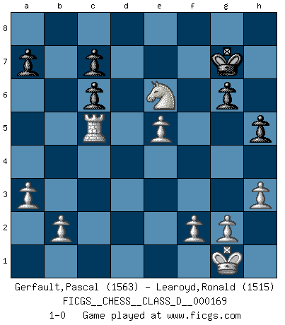 Last move : 1-0 2011 May 23 20:30:6 [Event "FICGS__CHESS__CLASS_D__000169"] [Site "FICGS"] [Date "2011.05.06"] [Round "1"] [White "Gerfault,Pascal"] [Black "Learoyd,Ronald"] [Result "1-0"] [WhiteElo "1563"] [BlackElo "1515"] 1.e4 e5 2.Nf3 Nc6 3.d4 d6 4.dxe5 dxe5 5.Qxd8+ Kxd8 6.Bc4 f6 7.O-O Bc5 8.Rd1+ Ke8 9.Nc3 Bg4 10.Nd5 Rc8 11.Be3 Bxe3 12.Nxe3 Nd4 13.Nxg4 Nxc2 14.Rac1 Nb4 15.a3 Nc6 16.Bb5 Nge7 17.Ne3 g6 18.Nd5 Kf8 19.Nxf6 Kf7 20.Nd7 Kg7 21.Ndxe5 Rhd8 22.Rxd8 Rxd8 23.Nxc6 Nxc6 24.Bxc6 bxc6 25.h3 Rd6 26.e5 Re6 27.Rc5 h6 28.Nd4 h5 29.Nxe6+ 1-0 Scotch Opening Kingside Castling by player White (move 7) Player White won this chess game. Follow this game move after move (download)I look one move ahead... the best ! (Siegbert Tarrasch) Am wohlsten fühle ich mich, wenn ich sehe, wie sich mein Gegner im Todeskampf windet. (Robert James Fischer) Las leyes del Ajedrez no permiten una libre elección: tienes que mover quieras o no. (Emanuel Lasker) Une platitude souvent récitée à propos des Echecs est qu'une des choses les plus difficiles à réaliser est de gagner une position gagnante. Cela ne manque pas de sens mais, pour ma part, j'ai toujours trouvé plus difficile de gagner une position perdante. (Tim Krabbe) Crush them ! Make them suffer ! (General Grievous in Star Wars ep.3)