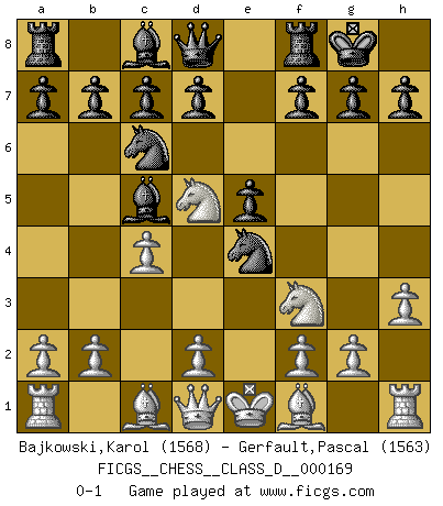 Last move : 0-1 2011 June 1 20:0:58 [Event "FICGS__CHESS__CLASS_D__000169"] [Site "FICGS"] [Date "2011.05.06"] [Round "1"] [White "Bajkowski,Karol"] [Black "Gerfault,Pascal"] [Result "0-1"] [WhiteElo "1568"] [BlackElo "1563"] 1.c4 e5 2.e4 Nf6 3.Nc3 Bc5 4.h3 O-O 5.Nf3 Nc6 6.Nd5 Nxe4 0-1 English Opening Kingside Castling by player Black (move 4) Player Black won this chess game. Follow this game move after move (download)Don't even mention losing to me. I can't stand to think of it. (Bobby Fischer) Um dein Spiel zu verbessern musst du zuallererst das Endspiel studieren, denn diese kann unabhängig studiert werden. Die Eröffnung und das Mittelspiel müssen immer in Bezug gesetzt werden zum Endspiel. (José Raúl Capablanca) La última cosa en que Fischer estaba interesado era en tonterías, siempre y cuando el Ajedrez estuviera involucrado. (Elie Agur) Seul un grand joueur sait à quel point il joue faiblement. (Xavier Tartacover) Players are not good because they find tactics, it is about the way to find the positions in which those tactics are hidden. (Luc-Olivier Leclerc)