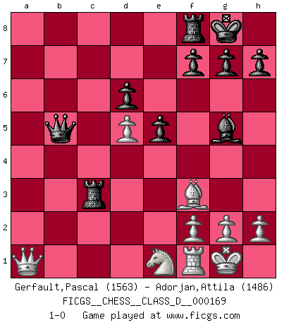 Last move : 1-0 2011 October 7 23:41:9 [Event "FICGS__CHESS__CLASS_D__000169"] [Site "FICGS"] [Date "2011.05.06"] [Round "1"] [White "Gerfault,Pascal"] [Black "Adorjan,Attila"] [Result "1-0"] [WhiteElo "1563"] [BlackElo "1486"] 1.e4 c5 2.Nf3 Nc6 3.d4 cxd4 4.Nxd4 Nf6 5.Nc3 e5 6.Ndb5 d6 7.Bg5 a6 8.Na3 b5 9.Nd5 Be7 10.Bxf6 Bxf6 11.c3 Bg5 12.Nc2 O-O 13.a4 bxa4 14.Rxa4 a5 15.Bc4 Bd7 16.O-O Nb4 17.Ra3 Rc8 18.Be2 Nxd5 19.exd5 Qb6 20.Ne1 Qxb2 21.Rxa5 Rxc3 22.Bf3 Bb5 23.Rxb5 Qxb5 24.Qa1 1-0 Sicilian : Pelikan (Lasker/Sveshnikov) variation Kingside Castling by player Black (move 12) Kingside Castling by player White (move 16) Player White won this chess game. Follow this game move after move (download)It was clear to me that the vulnerable point of the American Grandmaster (Bobby Fischer) was in double-edged, hanging, irrational positions, where he often failed to find a win even in a won position. (Efim Geller) Ich trinke, ich rauche, ich spiele, ich liebe Frauen aber Fernschach ist ein Laster, das ich nicht habe. (Mikhail Nekhemyevich Tal) Ser exitoso en el Ajedrez te permite descubrir tu propia personalidad. Eso es lo que deseo para los niños de mi clase. (Saudin Robovic) Le temps de noter son nom sur la feuille de partie, j'étais déjà en zeitnot ! D'un modeste amateur apparié lors de la première ronde d'un open contre le grand-maître Azmaïparashvili. I have opinions of my own - strong opinions - but I don't always agree with them. (George Bush)