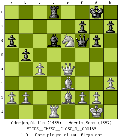 Last move : 1-0 2011 June 5 20:40:17 [Event "FICGS__CHESS__CLASS_D__000169"] [Site "FICGS"] [Date "2011.05.06"] [Round "1"] [White "Adorjan,Attila"] [Black "Harris,Ross"] [Result "1-0"] [WhiteElo "1486"] [BlackElo "1557"] 1.e4 c6 2.Nf3 d5 3.Nc3 dxe4 4.Nxe4 Nf6 5.Nxf6+ exf6 6.d4 Bd6 7.Bd3 O-O 8.O-O Bg4 9.h3 Bh5 10.Re1 Nd7 11.c4 Re8 12.Rxe8+ Qxe8 13.Be3 Nf8 14.Be2 Ne6 15.d5 cxd5 16.Qxd5 Qe7 17.Qxh5 Rd8 18.Rd1 a6 19.Qa5 f5 20.Qxf5 g6 21.Qe4 b5 22.Nd4 Qf6 23.Nxe6 1-0 Caro-Kann defense Kingside Castling by player Black (move 7) Kingside Castling by player White (move 8) Player White won this chess game. Follow this game move after move (download)Whoever sees no other aim in the game than that of giving checkmate to one's opponent will never become a good Chess player. (Euwe) Computer sind die einzigen Gegner, die nicht immer eine Ausrede auf Lager haben, wenn sie gegen mich verlieren. (Robert James Fischer) El Ajedrez es imaginación. (David Bronstein) Que feriez-vous si vous étiez en train de jouer aux échecs et que la fin du monde arrive ? Je continuerais à jouer. (Saint Borromée) All the biggest technological inventions created by man - the airplane, the automobile, the computer - says little about his intelligence, but speaks volumes about his laziness. (Mark Kennedy)