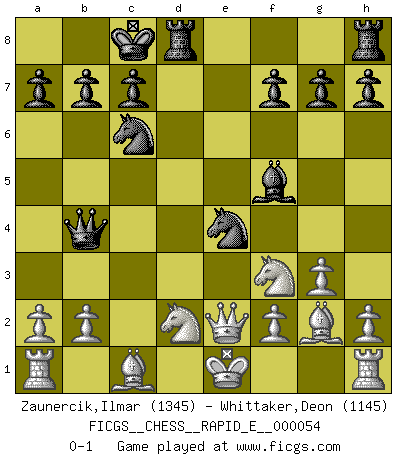 Last move : 0-1 2011 June 23 8:0:58 [Event "FICGS__CHESS__RAPID_E__000054"] [Site "FICGS"] [Date "2011.05.07"] [Round "1"] [White "Zaunercik,Ilmar"] [Black "Whittaker,Deon"] [Result "0-1"] [WhiteElo "1345"] [BlackElo "1145"] 1.e4 e5 2.Nf3 d6 3.d4 Nf6 4.dxe5 Nxe4 5.exd6 Bxd6 6.Qe2 Bb4+ 7.c3 Qe7 8.cxb4 Qxb4+ 9.Nbd2 Bf5 10.g3 Nc6 11.Bg2 O-O-O 0-1 This chess game has been lost on time (started : 2011.05.07 9:51:30) Philidor : Nimzovich variation Queenside Castling by player Black (move 11) Player Black won this chess game. Follow this game move after move (download)It's just you and your opponent at the board and you're trying to prove something. (Bobby Fischer) Ich glaube nicht an Psychologie, ich glaube an gute Züge. (Robert James Fischer) Los tropiezos estan todos ahí en el tablero, esperando que se cometan. (Savielly Tartakover) Le système Elo représente seulement une moyenne. Il est simplement un indicateur de votre stabilité. (Anatoli Karpov) Pretend inferiority and encourage his arrogance. (Sun Tzu)