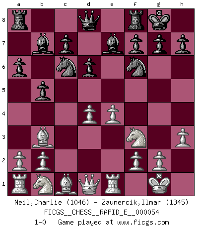 Last move : 1-0 2011 June 25 20:5:47 [Event "FICGS__CHESS__RAPID_E__000054"] [Site "FICGS"] [Date "2011.05.07"] [Round "1"] [White "Neil,Charlie"] [Black "Zaunercik,Ilmar"] [Result "1-0"] [WhiteElo "1046"] [BlackElo "1345"] 1.e4 e5 2.Nf3 Nc6 3.Bb5 a6 4.Ba4 d6 5.c3 Nf6 6.O-O Be7 7.h3 O-O 8.Re1 b5 9.Bb3 Bb7 10.d4 exd4 11.cxd4 1-0 This chess game has been lost on time (started : 2011.05.07 9:51:30) Ruy Lopez : Modern Steinitz defense Kingside Castling by player White (move 6) Kingside Castling by player Black (move 7) Player White won this chess game. Follow this game move after move (download)Place the contents of the Chess box in a hat, shake them up vigorously, pour them on the board from a height of two feet, and you get the style of Steinitz. (H. E. Bird) Wer der Ansicht ist, daß alle Schachspieler verrückt sind, wird durch Studium des Lebens von Emil Josef Diemer nicht auf andere Gedanken kommen. (Hans Ree) Buenas posiciones no logran ganar juegos, buenas movidas sí. (Gerald Abrahams) Les échecs, c'est l'art d'analyser. (Mikhail Botvinnik) Work expands to fill the time available. (C. Northcote Parkinson, in Parkinson's Laws)