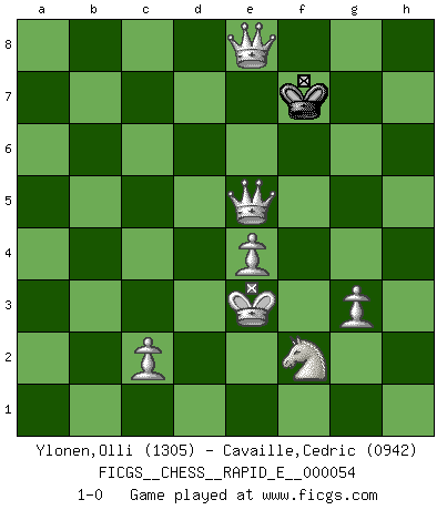 Last move : 1-0 2011 May 14 23:19:30 [Event "FICGS__CHESS__RAPID_E__000054"] [Site "FICGS"] [Date "2011.05.07"] [Round "1"] [White "Ylonen,Olli"] [Black "Cavaille,Cedric"] [Result "1-0"] [WhiteElo "1305"] [BlackElo "0942"] 1.d4 g6 2.e4 d6 3.Nc3 e5 4.dxe5 dxe5 5.Qxd8+ Kxd8 6.Bc4 Be6 7.Bxe6 fxe6 8.Bg5+ Be7 9.Bxe7+ Nxe7 10.O-O-O Nd7 11.Nf3 a6 12.Nxe5 Rf8 13.Rxd7+ Ke8 14.f3 Rd8 15.Rxc7 Nc6 16.Nxc6 bxc6 17.Rxc6 Ke7 18.Rxa6 Ra8 19.Rxa8 Rxa8 20.a4 Kf6 21.Rd1 Kg5 22.g3 h5 23.Kd2 Rd8+ 24.Ke3 Rxd1 25.Nxd1 h4 26.a5 hxg3 27.hxg3 Kh5 28.a6 g5 29.a7 g4 30.a8Q gxf3 31.b4 f2 32.Nxf2 e5 33.b5 Kg5 34.b6 Kh5 35.b7 Kg5 36.b8Q Kh5 37.Qxe5+ Kg6 38.Qc6+ Kf7 39.Qc6e8+ 1-0 Modern defense Queenside Castling by player White (move 10) Promotion Queen by player White (move 30) 10 pieces endgame at move 30 : White KQNPPPP , Black KPP WHITE : King + 1 Queen 1 Knight 4 Pawns BLACK : King + 2 Pawns 9 pieces endgame at move 32 : White KQNPPPP , Black KP WHITE : King + 1 Queen 1 Knight 4 Pawns BLACK : King + 1 Pawn Promotion Queen by player White (move 36) 8 pieces endgame at move 37 : White KQQNPPP , Black K WHITE : King + 2 Queens 1 Knight 3 Pawns BLACK : King + Player White won this chess game. Follow this game move after move (download)I feel as if I were a piece in a game of Chess, when my opponent says of it: That piece cannot be moved. (Soren Kierkegaard) Wer nie einen Fehler gemacht hat, hat nie etwas Neues ausprobiert. (Albert Einstein) Juega la Apertura como un libro, el Juego Medio como un mago y los Finales como una máquina. (Spielmann) Toute estimation doit être constamment réévaluée. (Jacob Estrin) Animated gif is worth one mega-word. (Unknown)