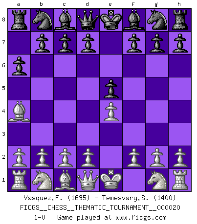 Last move : 1-0 2007 February 5 8:59:8 [Event "FICGS__CHESS__THEMATIC_TOURNAMENT__000020"] [Site "FICGS"] [Date "2006.12.22"] [Round "1"] [White "Vasquez,Fernando"] [Black "Temesvary,Sandor"] [Result "1-0"] [WhiteElo "1695"] [BlackElo "1400"] 1.e4 e5 2.Bb5 a6 3.Ba4 1-0 This chess game has been lost on time (started : 2006.12.22 12:58:19) King's pawn game Player White won this chess game. Follow this game move after move (download)The passed pawn is a criminal, who should be kept under lock and key. Mild measures, such as police surveillance, are not sufficient. (Nimzovitch) Smyslow ist ein Beweis dafür, dass ich noch zehn Jahre spielen kann! [der 75 jährige über den 85 jährigen] (Viktor Kortschnoi) El juego de Fischer siempre fue nítido, racional y brillante. Uno de los mejores por siempre. (Dave Regis) Si je n'étais pas joueur d'échecs, je serais le meilleur dans quelque chose d'autre. (Anatoli Karpov) Men should grow up. - Yeah. And dogs should stop licking themselves. It's not gonna happen. (Gregory House to Dr. Cameron, House M.D.)