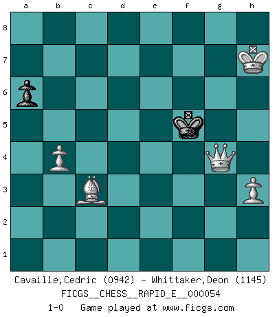 Last move : 1-0 2011 June 29 21:20:31 [Event "FICGS__CHESS__RAPID_E__000054"] [Site "FICGS"] [Date "2011.05.07"] [Round "1"] [White "Cavaille,Cedric"] [Black "Whittaker,Deon"] [Result "1-0"] [WhiteElo "0942"] [BlackElo "1145"] 1.e4 e5 2.Nf3 d6 3.d4 Nc6 4.dxe5 dxe5 5.Bc4 Be6 6.Bxe6 Qxd1+ 7.Kxd1 Bb4 8.Bd5 O-O-O 9.Nbd2 Rd7 10.Bxc6 bxc6 11.a3 Bxd2 12.Bxd2 Nf6 13.Nxe5 Nxe4 14.Nxd7 Nxf2+ 15.Ke2 Nxh1 16.Rxh1 Re8+ 17.Be3 Kxd7 18.Rd1+ Kc8 19.Kf2 a6 20.Re1 f5 21.Bd4 Rg8 22.Re7 Rd8 23.Bxg7 Rd2+ 24.Re2 Rxe2+ 25.Kxe2 Kd7 26.Ke3 Ke6 27.h3 h5 28.Kf4 c5 29.Kg5 Kf7 30.Bc3 h4 31.Kxf5 c6 32.Kg5 c4 33.b3 cxb3 34.cxb3 Ke6 35.Kxh4 Kd5 36.g4 c5 37.g5 Ke6 38.g6 Ke7 39.Kh5 Kf8 40.Kh6 Kg8 41.b4 cxb4 42.axb4 Kf8 43.Kh7 Ke7 44.g7 Ke6 45.g8Q+ Kf5 46.Qg4+ 1-0 Comment by player 2 : Deon Whittaker : This appears to be check, but why is it asking me to move? Philidor's defense Queenside Castling by player Black (move 8) 10 pieces endgame at move 34 : White KBPPPP , Black KPPP WHITE : King + 1 Bishop 4 Pawns BLACK : King + 3 Pawns 9 pieces endgame at move 35 : White KBPPPP , Black KPP WHITE : King + 1 Bishop 4 Pawns BLACK : King + 2 Pawns 8 pieces endgame at move 41 : White KBPPP , Black KPP WHITE : King + 1 Bishop 3 Pawns BLACK : King + 2 Pawns 7 pieces endgame at move 42 : White KBPPP , Black KP WHITE : King + 1 Bishop 3 Pawns BLACK : King + 1 Pawn Promotion Queen by player White (move 45) Player White won this chess game. Follow this game move after move (download)Morphy was probably the greatest genius of them all. (Bobby Fischer) Gewöhnliche Menschen denken nur daran, wie sie ihre Zeit verbringen. Ein intelligenter Mensch versucht, sie auszunutzen. (Arthur Schopenhauer) En un gambito tu regalas un Peón por el bién de tomar un juego perdido. (Samuel Standige Boden) La vie est comme un jeu d'échecs : nous esquissons un plan, mais celui-ci est tributaire de ce que daignent faire l'adversaire aux échecs et le destin dans la vie. (Arthur Schopenhauer) Ah, beer! The cause of, and the solution to, all of life's problems. (Homer Simpson)