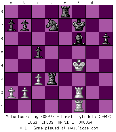 Last move : 0-1 2011 June 7 2:41:36 [Event "FICGS__CHESS__RAPID_E__000054"] [Site "FICGS"] [Date "2011.05.07"] [Round "1"] [White "Melquiades,Jay"] [Black "Cavaille,Cedric"] [Result "0-1"] [WhiteElo "0897"] [BlackElo "0942"] 1.e4 c5 2.Nf3 d6 3.Nc3 Nf6 4.Qe2 e6 5.d3 Be7 6.e5 dxe5 7.Bg5 h6 8.Bh4 g5 9.Bg3 Nc6 10.Nxe5 Nd7 11.Nxf7 Kxf7 12.Ne4 Nf6 13.h4 Nxe4 14.O-O-O Nxg3 15.fxg3 gxh4 16.gxh4 e5 17.Qf3+ Bf6 18.g4 Qd4 19.Kd2 Qf4+ 20.Qxf4 exf4 21.c3 Bxg4 22.Be2 Bxe2 23.Kxe2 Rhe8+ 24.Kf3 Re3+ 25.Kxf4 Rae8 26.Rhf1 Bxh4 27.Kg4 Bf6 28.Rf2 Ne5+ 29.Kf4 Rxd3 30.Rdf1 Nd7 0-1 Sicilian Queenside Castling by player White (move 14) Player Black won this chess game. Follow this game move after move (download)A player surprised is half beaten. (Proverb) Im Schach gibt es keinen Platz für Galanterie. (Irving Chernev) Un buen jugador siempre tiene buena suerte. (José Raúl Capablanca) L'action d'une oeuvre littéraire se déroule sur un champ de bataille. Les masques et les types du drame moderne correspondent aux pièces du jeu d'échecs. L'intrigue correspond aux coups et aux gambits, c'est à dire aux techniques du jeu telles qu'utilisées et interprétées par les joueurs. Les tactiques et les péripéties [mouvements] correspondent aux coups exécutés par l'adversaire. (Viktor Shklovsky) Experience is the name we all give to our mistakes. (Oscar Wilde)