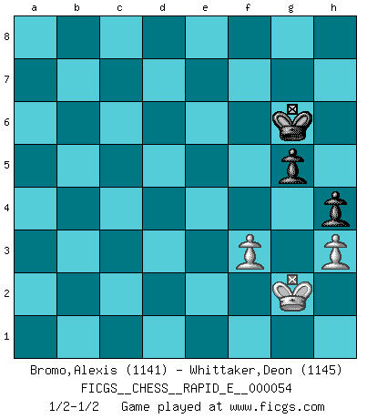 Last move : 1/2-1/2 2011 July 21 19:28:23 [Event "FICGS__CHESS__RAPID_E__000054"] [Site "FICGS"] [Date "2011.05.07"] [Round "1"] [White "Bromo,Alexis"] [Black "Whittaker,Deon"] [Result "1/2-1/2"] [WhiteElo "1141"] [BlackElo "1145"] 1.d4 Nf6 2.c4 e6 3.Nc3 Bb4 4.Bd2 Nc6 5.a3 Qe7 6.axb4 Nxb4 7.e3 d5 8.Nf3 c5 9.Be2 a6 10.h3 b6 11.Ne5 O-O 12.O-O cxd4 13.exd4 Bb7 14.b3 Rfd8 15.Bh5 g6 16.Bg4 Nc6 17.Nxc6 Bxc6 18.Bg5 Kg7 19.Re1 dxc4 20.bxc4 Rd6 21.Ne4 Bxe4 22.Rxe4 Ra7 23.Bxf6+ Qxf6 24.Qd2 a5 25.c5 bxc5 26.Rxa5 Rxd4 27.Rxd4 Rxa5 28.Rd7 Ra1+ 29.Kh2 h5 30.Bxe6 Qxe6 31.Qc3+ Kh6 32.Qxa1 Qxd7 33.Qc1+ g5 34.Qxc5 f6 35.Qf8+ Qg7 36.Qxg7+ Kxg7 37.Kg3 h4+ 38.Kg4 Kg6 39.g3 f5+ 40.Kf3 Kh5 41.g4+ Kg6 42.gxf5+ Kxf5 43.Kg2 Kg6 44.Kf3 Kf5 45.Kg2 Kg6 46.f3 1/2-1/2 Nimzo-Indian defense Kingside Castling by player Black (move 11) Kingside Castling by player White (move 12) 10 pieces endgame at move 34 : White KQPPP , Black KQPPP WHITE : King + 1 Queen 3 Pawns BLACK : King + 1 Queen 3 Pawns 9 pieces endgame at move 36 : White KQPPP , Black KPPP WHITE : King + 1 Queen 3 Pawns BLACK : King + 3 Pawns 8 pieces endgame at move 36 : White KPPP , Black KPPP WHITE : King + 3 Pawns BLACK : King + 3 Pawns 7 pieces endgame at move 42 : White KPPP , Black KPP WHITE : King + 3 Pawns BLACK : King + 2 Pawns 6 pieces endgame at move 42 : White KPP , Black KPP WHITE : King + 2 Pawns BLACK : King + 2 Pawns This chess game ended in a draw. Follow this game move after move (download)Chess is mental torture. (Garry Kasparov) Ich verstehe Aljechins Kombinationen ganz gut; aber woher er diese Angriffschancen bekommt und wie er die Eröffnung behandelt das ist für mich ein Buch mit sieben Siegeln. (Rudolf Spielmann) Yo considero que Fischer es uno de los expertos mas grandes de aperturas de siempre. (Keith Hayward) Les écrivains ont utilisé les échecs pour analyser les côtés extrêmes de la nature humaine. Dans ce cadre, les échecs offrent un champ d'expérimentation idéal. Mais on pourrait faire la même chose avec la peinture. Et là, en vous référant à Van Gogh, vous ne tirerez pas de conclusion définitive sur les peintres. (Gary Kasparov) A shortcut is the longest distance between two points. (Don Groves)