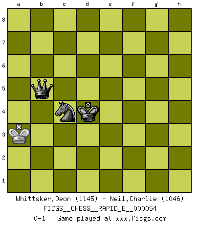 Last move : 0-1 2011 August 8 19:40:54 [Event "FICGS__CHESS__RAPID_E__000054"] [Site "FICGS"] [Date "2011.05.07"] [Round "1"] [White "Whittaker,Deon"] [Black "Neil,Charlie"] [Result "0-1"] [WhiteElo "1145"] [BlackElo "1046"] 1.e4 c5 2.Nf3 Nc6 3.c3 Nf6 4.Bd3 e6 5.Na3 Be7 6.Nc4 d5 7.Nce5 dxe4 8.Bxe4 Nxe5 9.Qe2 Nxf3+ 10.Bxf3 O-O 11.d3 Qc7 12.g3 e5 13.O-O Be6 14.Re1 Rad8 15.c4 Bf5 16.Rd1 Rfe8 17.a3 b6 18.g4 Bc8 19.b4 e4 20.Bxe4 Bd6 21.d4 Nxe4 22.f3 Bxh2+ 23.Qxh2 Qxh2+ 24.Kxh2 Nc3 25.Bg5 f6 26.Rd3 Ne2 27.Rad1 fxg5 28.dxc5 Nf4 29.Rxd8 Kf7 30.R1d7+ Bxd7 31.Rxd7+ Re7 32.c6 Rxd7 33.cxd7 Ke7 34.c5 bxc5 35.bxc5 Kxd7 36.Kg3 Nd3 37.a4 Nxc5 38.a5 a6 39.f4 gxf4+ 40.Kxf4 Ke6 41.Kg5 Ke5 42.Kh5 Nb3 43.g5 Nxa5 44.g6 hxg6+ 45.Kxg6 Nc4 46.Kxg7 a5 47.Kf7 a4 48.Ke7 a3 49.Kd7 a2 50.Kc6 a1Q 51.Kc5 Ne3 52.Kb4 Kd5 53.Kb3 Kd4 54.Kb4 Qa6 55.Kb3 Qb5+ 56.Ka3 Nc4+ 0-1 Sicilian defense Kingside Castling by player Black (move 10) Kingside Castling by player White (move 13) 10 pieces endgame at move 37 : White KPPP , Black KNPPPP WHITE : King + 3 Pawns BLACK : King + 1 Knight 4 Pawns 9 pieces endgame at move 39 : White KPP , Black KNPPPP WHITE : King + 2 Pawns BLACK : King + 1 Knight 4 Pawns 8 pieces endgame at move 40 : White KPP , Black KNPPP WHITE : King + 2 Pawns BLACK : King + 1 Knight 3 Pawns 7 pieces endgame at move 43 : White KP , Black KNPPP WHITE : King + 1 Pawn BLACK : King + 1 Knight 3 Pawns 6 pieces endgame at move 44 : White K , Black KNPPP WHITE : King + BLACK : King + 1 Knight 3 Pawns 5 pieces endgame at move 45 : White K , Black KNPP WHITE : King + BLACK : King + 1 Knight 2 Pawns 4 pieces endgame at move 46 : White K , Black KNP WHITE : King + BLACK : King + 1 Knight 1 Pawn Promotion Queen by player Black (move 50) Player Black won this chess game. Follow this game move after move (download)The passed pawn is a criminal, who should be kept under lock and key. Mild measures, such as police surveillance, are not sufficient. (Nimzovitch) Ich verstehe den Grund nicht, warum die Aufteilung in Frauen und Männer überhaupt im Schach besteht. (Judith Polgar) No existe un remordimiento como el remordimiento del Ajedrez. (H. G. Wells) Les ravages du H expliquent la différence de niveau entre Tal et Thal [Abergel]. When you have everything, sometimes it feels like nothing. (Horatio Caine, C.S.I. Miami)