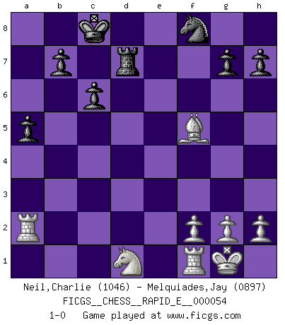 Last move : 1-0 2011 July 4 17:29:57 [Event "FICGS__CHESS__RAPID_E__000054"] [Site "FICGS"] [Date "2011.05.07"] [Round "1"] [White "Neil,Charlie"] [Black "Melquiades,Jay"] [Result "1-0"] [WhiteElo "1046"] [BlackElo "0897"] 1.e4 e5 2.Nf3 d6 3.Bc4 Be6 4.Be2 f6 5.Nc3 c6 6.d4 d5 7.exd5 Bb4 8.dxe6 Ne7 9.dxe5 Nf5 10.O-O Qxd1 11.Nxd1 Na6 12.a3 Ba5 13.b4 Bxb4 14.axb4 Nxb4 15.Ba3 Nxc2 16.Ra2 Ncd4 17.Nxd4 Nxd4 18.Bd3 a5 19.exf6 O-O-O 20.f7 Nxe6 21.Be7 Rd7 22.f8Q+ Rxf8 23.Bxf8 Nxf8 24.Bf5 1-0 Philidor's defense Kingside Castling by player White (move 10) Queenside Castling by player Black (move 19) Promotion Queen by player White (move 22) Player White won this chess game. Follow this game move after move (download)The essence of Chess is thinking about what Chess is. (David Bronstein) Im Fernschach kannst du während dem Spiel rauchen. (John Christen Knudsen) Bobby solo arroja las piezas y solas caen en las casillas correctas. (Miguel Najdorf ) Avant la finale, les dieux ont créé le milieu de partie. (Tarrasch) The Internet is the world's largest library. It's just that all the books are on the floor. (John Allen Paulos)
