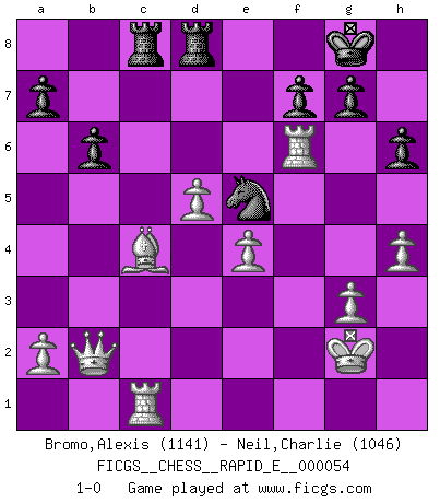 Last move : 1-0 2011 July 12 13:3:45 [Event "FICGS__CHESS__RAPID_E__000054"] [Site "FICGS"] [Date "2011.05.07"] [Round "1"] [White "Bromo,Alexis"] [Black "Neil,Charlie"] [Result "1-0"] [WhiteElo "1141"] [BlackElo "1046"] 1.d4 Nf6 2.c4 e6 3.Nc3 Bb4 4.Bd2 O-O 5.Nf3 Bxc3 6.Bxc3 Ne4 7.e3 c5 8.Bd3 Nxc3 9.bxc3 Nc6 10.Qb1 Qa5 11.Qc1 b6 12.O-O Ba6 13.Ng5 h6 14.Ne4 d5 15.Nd2 cxd4 16.cxd4 Bxc4 17.Nxc4 dxc4 18.Bxc4 Rac8 19.Qb2 Rfd8 20.Rfd1 Qg5 21.Rac1 e5 22.d5 Ne7 23.e4 Ng6 24.g3 Nf4 25.Kh1 Nh3 26.Rf1 Qf6 27.Kg2 Ng5 28.f3 Nh7 29.h4 Nf8 30.f4 Nd7 31.fxe5 Nxe5 32.Rxf6 1-0 Nimzo-Indian defense Kingside Castling by player Black (move 4) Kingside Castling by player White (move 12) Player White won this chess game. Follow this game move after move (download)Strategy requires thought, tactics require observation. (Max Euwe) Im Spitzenschach von heute geht es nur um Vorbereitung, um tiefgründige, sorgfältige Eröffnungsvorbereitung. (Nigel Short) Buenas posiciones no logran ganar juegos, buenas movidas sí. (Gerald Abrahams) Seul un grand joueur sait à quel point il joue faiblement. (Xavier Tartacover) Never risk one's whole fortune unless supported by one's entire army. (Niccolo Machiavelli)