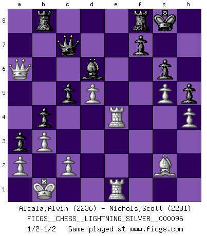 Last move : 1/2-1/2 2011 May 9 20:1:22 [Event "FICGS__CHESS__LIGHTNING_SILVER__000096"] [Site "FICGS"] [Date "2011.05.09"] [Round "1"] [White "Alcala,Alvin"] [Black "Nichols,Scott"] [Result "1/2-1/2"] [WhiteElo "2236"] [BlackElo "2281"] 1.e4 c5 2.Nf3 d6 3.d4 cxd4 4.Nxd4 Nf6 5.Nc3 a6 6.h3 e5 7.Nde2 Be7 8.g4 h5 9.g5 Nfd7 10.Nd5 Nc5 11.Nec3 Nc6 12.Be3 Be6 13.Qd2 Bxd5 14.exd5 Nd4 15.O-O-O Nf5 16.Bxc5 dxc5 17.h4 b5 18.f4 exf4 19.Qxf4 Nd6 20.Rh2 O-O 21.Re2 b4 22.Ne4 Nxe4 23.Rxe4 Bd6 24.Qf3 g6 25.Rde1 Qd7 26.Bh3 Qc7 27.Qd3 a5 28.Kb1 a4 29.Bg2 Rab8 30.Qa6 a3 31.b3 1/2-1/2 Sicilian : Najdorf, Adams attack Queenside Castling by player White (move 15) Kingside Castling by player Black (move 20) This chess game ended in a draw. Follow this game move after move (download)Fischer is completely natural. He plays no roles. He's like a child. Very, very simple. (Zita Rajcsanyi) Wenn ich Weiß habe gewinne ich weil ich Weiß habe, wenn ich Schwarz habe gewinne ich weil ich Bogoljubov bin. (Efim Bogoljubov) Si no le temes a Spassky, entonces elimino el elemento del dinero. (Jim Slater) On entre au jeu d'Echecs comme on entre en Religion. Pour le joueur d'Echecs, la partie d'Echecs c'est l'office, la messe, le défilé du 1er Mai, le dépôt de gerbe au Monument aux Morts. C'est un drame sacré. (Michel Roos) Vladimir Ras-Putin is still alive... He is also a good actor, I saw him in the Lord of the Rings. (Rodolfo d'Ettorre)