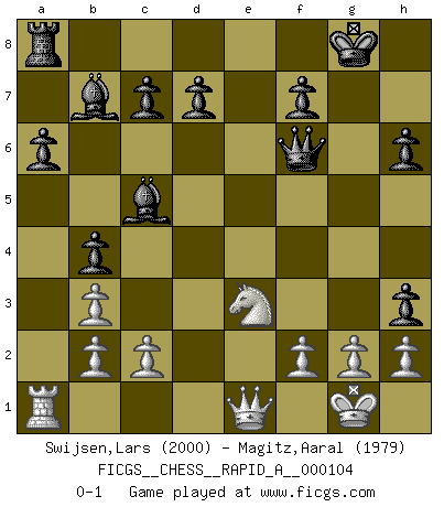 Last move : 0-1 2011 July 8 20:11:24 [Event "FICGS__CHESS__RAPID_A__000104"] [Site "FICGS"] [Date "2011.05.09"] [Round "1"] [White "Swijsen,Lars"] [Black "Magitz,Aaral"] [Result "0-1"] [WhiteElo "2000"] [BlackElo "1979"] 1.e4 e5 2.Nf3 Nc6 3.Nc3 Nf6 4.Bb5 Bd6 5.O-O O-O 6.d3 a6 7.Bc4 b5 8.Bb3 Na5 9.Bg5 h6 10.Bh4 Bb7 11.d4 exd4 12.Nxd4 Re8 13.Nf5 Nxb3 14.axb3 Bf8 15.Re1 g5 16.e5 b4 17.Na4 gxh4 18.exf6 Rxe1+ 19.Qxe1 Qxf6 20.Ne3 h3 21.Nc5 Bxc5 0-1 This chess game has been lost on time (started : 2011.05.09 21:51:40) Four knights : Spanish variation Kingside Castling by player White (move 5) Kingside Castling by player Black (move 5) Player Black won this chess game. Follow this game move after move (download)There are two classes of men; those who are content to yield to circumstances and who play whist; those who aim to control circumstances, and who play Chess. (Mortimer Collins) Je älter ich werde, um so mehr schätze ich die Bauern. (Paul Keres) Un buen jugador siempre tiene buena suerte. (José Raúl Capablanca) Les sacrifices démontrent seulement que quelqu'un a gaffé. (Savielly Tartacover) You cannot beat a roulette table unless you steal money from it. (Albert Einstein)