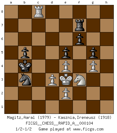Last move : 1/2-1/2 2011 June 4 22:17:8 [Event "FICGS__CHESS__RAPID_A__000104"] [Site "FICGS"] [Date "2011.05.09"] [Round "1"] [White "Magitz,Aaral"] [Black "Kasznia,Ireneusz"] [Result "1/2-1/2"] [WhiteElo "1979"] [BlackElo "1918"] 1.Nf3 d5 2.c4 d4 3.b4 Bg4 4.Qb3 Nf6 5.g3 a5 6.Bg2 Nbd7 7.Nxd4 e5 8.Nc2 axb4 9.Nxb4 Nc5 10.Qb2 Bd6 11.Nc3 O-O 12.d3 c6 13.a4 Nfd7 14.O-O Qb6 15.Nc2 Bc7 16.Qxb6 Bxb6 17.h3 Bf5 18.g4 Bg6 19.Be3 Nb3 20.Ra3 Bxe3 21.fxe3 Na5 22.Be4 Nc5 23.Bxg6 hxg6 24.R3a1 g5 25.Rab1 g6 26.Ne1 Rae8 27.e4 Nab3 28.Nf3 f6 29.Kf2 Kg7 30.Rh1 Rh8 31.h4 gxh4 32.Rxh4 Rxh4 33.Nxh4 Nd4 34.Nf3 Nde6 35.Kg3 Rh8 36.Rf1 g5 37.Kf2 Nf4 38.Rd1 Kf7 39.Rb1 Ke6 40.Rf1 Ra8 41.Ra1 Kd7 42.Ra2 Kc7 43.Ra3 Kb6 44.Ra1 Ka5 45.Rb1 Rh8 46.Ke3 Ka6 47.Rd1 Ka5 48.Rb1 Rh7 49.Kf2 Nxa4 50.Nxa4 Kxa4 51.Ra1+ Kb4 52.Ra8 Rf7 53.Ke3 Ne6 54.Re8 Nc5 55.Rh8 Nb3 56.Ra8 Nc5 57.Rd8 Kc3 58.Rd6 Nb3 59.Rd8 b5 60.cxb5 cxb5 61.Rc8+ Kb4 1/2-1/2 Reti : Advance variation Kingside Castling by player Black (move 11) Kingside Castling by player White (move 14) This chess game ended in a draw. Follow this game move after move (download)Fischer was a master of clarity and a king of artful positioning. His opponents would see where he was going but were powerless to stop him. (Bruce Pandolfini) Frage des Reporters: -Worin besteht das Ziel von Gambiteröffnungen? Antwort: -Auf Kosten der Partie einen Ruf als Angriffspieler zu erwerben.- (Siegbert Tarrasch) Prefiero perder una partida realmente buena, que ganar una mala. (David Levy) Comme les marins qui ont mille raisons différentes d'aller en mer, les joueurs d'échecs en ont tout autant avant de s'installer devant une table et jouer... (Vincent Bertignac, philosophe) Everybody lies. (Gregory House, House M.D.)