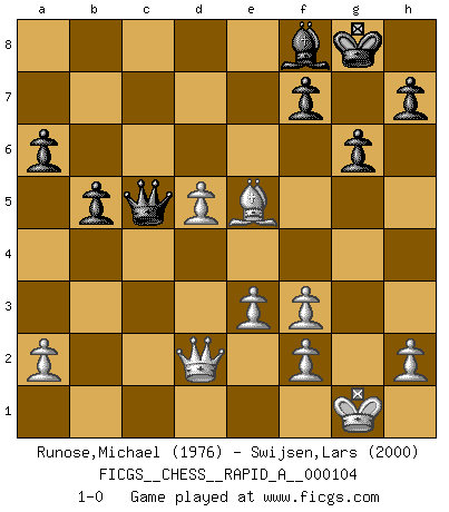 Last move : 1-0 2011 July 7 20:10:0 [Event "FICGS__CHESS__RAPID_A__000104"] [Site "FICGS"] [Date "2011.05.09"] [Round "1"] [White "Runose,Michael"] [Black "Swijsen,Lars"] [Result "1-0"] [WhiteElo "1976"] [BlackElo "2000"] 1.d4 Nf6 2.c4 g6 3.Nc3 d5 4.Nf3 Bg7 5.Bg5 Ne4 6.Bf4 O-O 7.e3 Nxc3 8.bxc3 c5 9.cxd5 cxd4 10.cxd4 Qxd5 11.Be2 Bf5 12.O-O Nc6 13.Qa4 a6 14.Rac1 Rac8 15.Rc5 Qd7 16.Qa3 Rfd8 17.Rfc1 Bf8 18.Qb2 e5 19.Nxe5 Nxe5 20.Rxc8 Rxc8 21.Rxc8 Qxc8 22.Bxe5 b5 23.d5 Qc5 24.Qd2 Be4 25.Bf3 Bxf3 26.gxf3 1-0 This chess game has been lost on time (started : 2011.05.09 21:51:40) King's Indian defense, 3.Nc3 Kingside Castling by player Black (move 6) Kingside Castling by player White (move 12) Player White won this chess game. Follow this game move after move (download)Not all artists are Chess players, but all Chess players are artists. (Marcel Duchamp) Das Spiel gibt uns die Genugtuung, die das Leben uns versagt. (Emanuel Lasker) El Ajedrez es un terrible juego. Si no controlas el centro, tu oponente tiene una posición mas holgada. Si tienes control del centro, ¡entonces realmente tu tienes algo de que preocuparte!. (Siegbert Tarrasch) Aucun coup ne doit être joué sans but. (Pedro Damiano) Somewhere in the world there is an epigram for every dilemma. (Hendrik Willem van Loon)