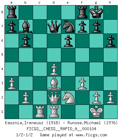 Last move : 1/2-1/2 2011 May 18 21:20:14 [Event "FICGS__CHESS__RAPID_A__000104"] [Site "FICGS"] [Date "2011.05.09"] [Round "1"] [White "Kasznia,Ireneusz"] [Black "Runose,Michael"] [Result "1/2-1/2"] [WhiteElo "1918"] [BlackElo "1976"] 1.d4 Nf6 2.c4 e6 3.Nc3 Bb4 4.e3 b6 5.Bd3 Bb7 6.f3 c5 7.Nge2 O-O 8.Bd2 Nc6 9.O-O cxd4 10.exd4 d5 11.cxd5 Nxd5 12.Nxd5 Bxd2 13.Qxd2 Qxd5 14.Rfd1 Qd7 15.Rac1 Ne7 16.a3 h6 1/2-1/2 Nimzo-Indian : Fischer variation Kingside Castling by player Black (move 7) Kingside Castling by player White (move 9) This chess game ended in a draw. Follow this game move after move (download)The older I grow, the more I value Pawns. (Keres) Die Jungen erwarten, dass Opa einfach umfällt. Dann aber kann Opa fünf Stunden lang Schach spielen und die jungen Gegner an die Wand drücken. (Viktor Kortschnoi) Aún deseo matar a Fischer. (Boris Spassky) Le jeu d'échecs est comme rejeté hors du temps. (Antoine de Saint-Exupéry) For to win one hundred victories in one hundred battles is not the acme of skill. To subdue the enemy without fighting is the acme of skill. (Sun Tzu)