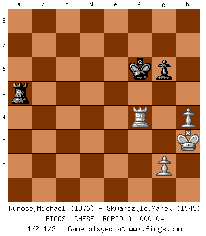 Last move : 1/2-1/2 2011 June 4 22:33:46 [Event "FICGS__CHESS__RAPID_A__000104"] [Site "FICGS"] [Date "2011.05.09"] [Round "1"] [White "Runose,Michael"] [Black "Skwarczylo,Marek"] [Result "1/2-1/2"] [WhiteElo "1976"] [BlackElo "1945"] 1.d4 Nf6 2.c4 g6 3.Nc3 Bg7 4.e4 O-O 5.Nf3 d6 6.Be2 e5 7.Be3 Ng4 8.Bg5 f6 9.Bh4 Nd7 10.O-O Nh6 11.h3 c6 12.d5 c5 13.Qc2 Nf7 14.a3 a6 15.Rab1 Ng5 16.Qd2 Bh6 17.Bxg5 Bxg5 18.Nxg5 fxg5 19.b4 a5 20.Nb5 axb4 21.axb4 Ra6 22.Bg4 cxb4 23.Bxd7 Bxd7 24.Rxb4 Qb6 25.Rfb1 Qc5 26.Qe3 Qxe3 27.fxe3 Rc8 28.Nc3 b6 29.Rxb6 Rxb6 30.Rxb6 Rxc4 31.Rxd6 Rxc3 32.Rxd7 Rxe3 33.Re7 Rxe4 34.d6 Kf8 35.Rxh7 Ke8 36.Kh2 Rd4 37.Re7+ Kf8 38.Rxe5 Rxd6 39.Rxg5 Kf7 40.h4 Ra6 41.Kh3 Kf6 42.Rg4 Ra5 43.Rf4+ 1/2-1/2 King's Indian : 4.e4 Kingside Castling by player Black (move 4) Kingside Castling by player White (move 10) 10 pieces endgame at move 35 : White KRPPP , Black KRPPP WHITE : King + 1 Rook 3 Pawns BLACK : King + 1 Rook 3 Pawns 9 pieces endgame at move 38 : White KRPPP , Black KRPP WHITE : King + 1 Rook 3 Pawns BLACK : King + 1 Rook 2 Pawns 8 pieces endgame at move 38 : White KRPP , Black KRPP WHITE : King + 1 Rook 2 Pawns BLACK : King + 1 Rook 2 Pawns 7 pieces endgame at move 39 : White KRPP , Black KRP WHITE : King + 1 Rook 2 Pawns BLACK : King + 1 Rook 1 Pawn This chess game ended in a draw. Follow this game move after move (download)Combinations have always been the most intriguing aspect of Chess. The masters look for them, the public applauds them, the critics praise them. It is because combinations are possible that Chess is more than a lifeless mathematical exercise. They are the poetry of the game; they are to Chess what melody is to music. They represent the triumph of mind over matter. (Reuben Fine) Schach ist Leben. (Robert James Fischer) El Ajedrez no es como la vida... ¡tiene reglas!. (Mark Pasternak) Les erreurs sont comme les malheurs, elles n'arrivent jamais seules. (Siegbert Tarrasch) But they are useless. They can only give you answers. (Pablo Picasso, about computers)