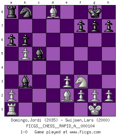Last move : 1-0 2011 July 1 8:11:12 [Event "FICGS__CHESS__RAPID_A__000104"] [Site "FICGS"] [Date "2011.05.09"] [Round "1"] [White "Domingo,Jordi"] [Black "Swijsen,Lars"] [Result "1-0"] [WhiteElo "2035"] [BlackElo "2000"] 1.b4 d5 2.Bb2 e6 3.Nf3 Nf6 4.b5 c5 5.e3 Bd6 6.c4 O-O 7.Nc3 b6 8.d4 Bb7 9.cxd5 exd5 10.Be2 Ne4 11.dxc5 Bxc5 12.O-O Re8 13.Qb3 Nf6 14.Rfd1 a6 15.Nxd5 Bxd5 16.Bxf6 Bxb3 17.Rxd8 Rxd8 18.Bxd8 1-0 This chess game has been lost on time (started : 2011.05.09 21:51:40) Polish (Sokolsky) opening Kingside Castling by player Black (move 6) Kingside Castling by player White (move 12) Player White won this chess game. Follow this game move after move (download)During a Chess competition a Chessmaster should be a combination of a beast of prey and a monk. (Alexander Alekhine) Ich habe kein Problem mit Frauen, sondern nur mit dem Niveau ihres Schachspiels (Judith Polgar) En el tablero, la mentira e hipocresía no sobreviven mucho. (Emanuel Lasker) Donnez-moi un Cavalier en 6e et je gagnerais toutes mes parties. (Steinitz) He who defends everything defends nothing. (Frederick the Great)