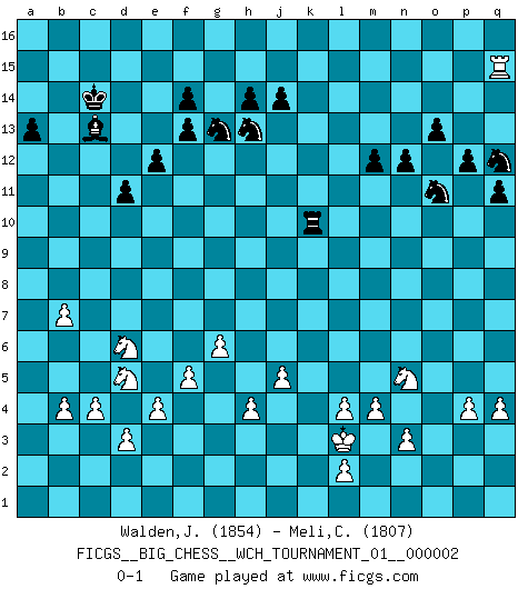 Last move : 0-1 2011 November 14 11:18:27 [Event "FICGS__BIG_CHESS__WCH_TOURNAMENT_01__000002"] [Site "FICGS"] [Date "2011.05.10"] [Round "1"] [White "Walden,Janeen"] [Black "Meli,Cosimo Leonardo"] [Result "0-1"] [WhiteElo "1854"] [BlackElo "1807"] 1.j2-k4 m15-m13 2.h1-o7 h15-g13 3.o7-c7 j15-k13 4.c7-c15 h16-o10 5.h2-g4 o10-o2 6.b1-c3 e15-e13 7.c15-c10 k16-h15 8.m2-m4 o2-o8 9.p1-o3 d15-d13 10.l1-p5 o8-b8 11.k1-h2 g16-j15 12.e2-e4 b16-c14 13.f1-b5 c16-e14 14.d2-d3 a16-c16 15.a2-a4 n15-n13 16.n2-n3 o15-o14 17.o1-j6 p16-n15 18.c1-h6 f16-b12 19.p5-l9 n15-o13 20.g1-j2 b15-b14 21.c3-d5 a15-a13 22.m1-m3 c14-d12 23.c10-o10 b12-c13 24.c2-c4 g13-f11 25.o3-n5 h15-g13 26.q1-o1 k13-m12 27.o1-o8 b8-f12 28.j2-h4 o16-k12 29.o8-o2 f12-h10 30.j1-j2 h10-o10 31.o2-o10 j15-k13 32.e1-o1 k12-j11 33.o1-o2 j11-l9 34.h6-l9 e14-h11 35.m3-l3 h11-b5 36.a4-b5 o13-n15 37.a1-a8 l16-o13 38.h2-j4 p15-p14 39.j4-h6 m16-m14 40.f2-f4 m14-l14 41.g4-j5 m12-k11 42.l9-p5 l14-l3 43.k2-l3 j16-j15 44.g2-g4 c13-b12 45.h4-k5 c16-c10 46.o10-c10 d12-c10 47.j6-h7 e16-c16 48.g4-g5 d13-d12 49.o2-o7 c10-e9 50.h3-h4 c16-c8 51.a8-c8 e9-c8 52.h7-o13 n15-o13 53.o7-c7 f11-d10 54.p5-k10 o13-m12 55.h6-f7 m12-o11 56.b5-b6 o14-o13 57.b6-b7 c8-b10 58.c7-c15 b10-c12 59.k10-g7 b12-d14 60.c15-b15 q16-a16 61.g7-d10 c12-d10 62.b15-b14 d14-b12 63.g5-g6 p14-p13 64.j5-h7 f15-f14 65.f4-f5 q15-q13 66.k4-j6 p13-p12 67.l3-l4 q13-q12 68.j3-j4 q12-q11 69.j4-j5 k11-m10 70.k5-l7 k13-j11 71.j6-h8 n13-n12 72.j2-k3 j15-h15 73.b2-b4 a16-c16 74.p2-p4 h15-g14 75.q2-q4 g14-f13 76.b14-b15 j11-h13 77.h7-g9 f13-e14 78.f7-e9 e14-d14 79.e9-d11 d14-c14 80.b15-a15 c14-b14 81.a15-d15 b12-a11 82.h8-j10 d10-e12 83.j10-h12 e12-c13 84.d11-c13 a11-c13 85.h12-f13 b14-c14 86.d15-e15 g15-g14 87.e15-k15 g14-f13 88.k15-l15 c16-b16 89.g9-f7 d12-d11 90.f7-d6 e13-e12 91.l7-m9 m13-m12 92.l15-o15 o11-q12 93.o15-q15 m10-o11 94.m9-k10 b16-k16 95.k3-l3 k16-k10 0-1 Follow this game move after move (download)Chess holds its master in its own bonds, shackling the mind and brain so that the inner freedom of the very strongest must suffer. (Albert Einstein) Kleine Schachspieler machen Mist, und große Schachspieler machen Mist, aber große machen weniger Mist. (Fritz Sämisch) El Ajedrez es 99 por ciento táctica. (Teichmann) Tout change constamment, y compris dans le monde des Echecs. (Botvinnik) Pretend inferiority and encourage his arrogance. (Sun Tzu)